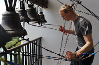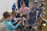Звонари-профессионалы уже не первый год приезжают в обитель в пасхальные дни. В этот раз у монастырской колокольни была установлена переносная учебная звонница, за которой был проведен мастер-класс для всех желающих научиться звонить в колокола.