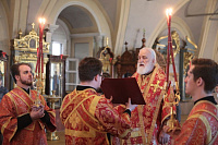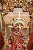 По заамвонной молитве был совершен благодарственный молебен, за которым митрополит Павел вознес молитву о здравии Святейшего Патриарха Московского и всея Руси Кирилла.