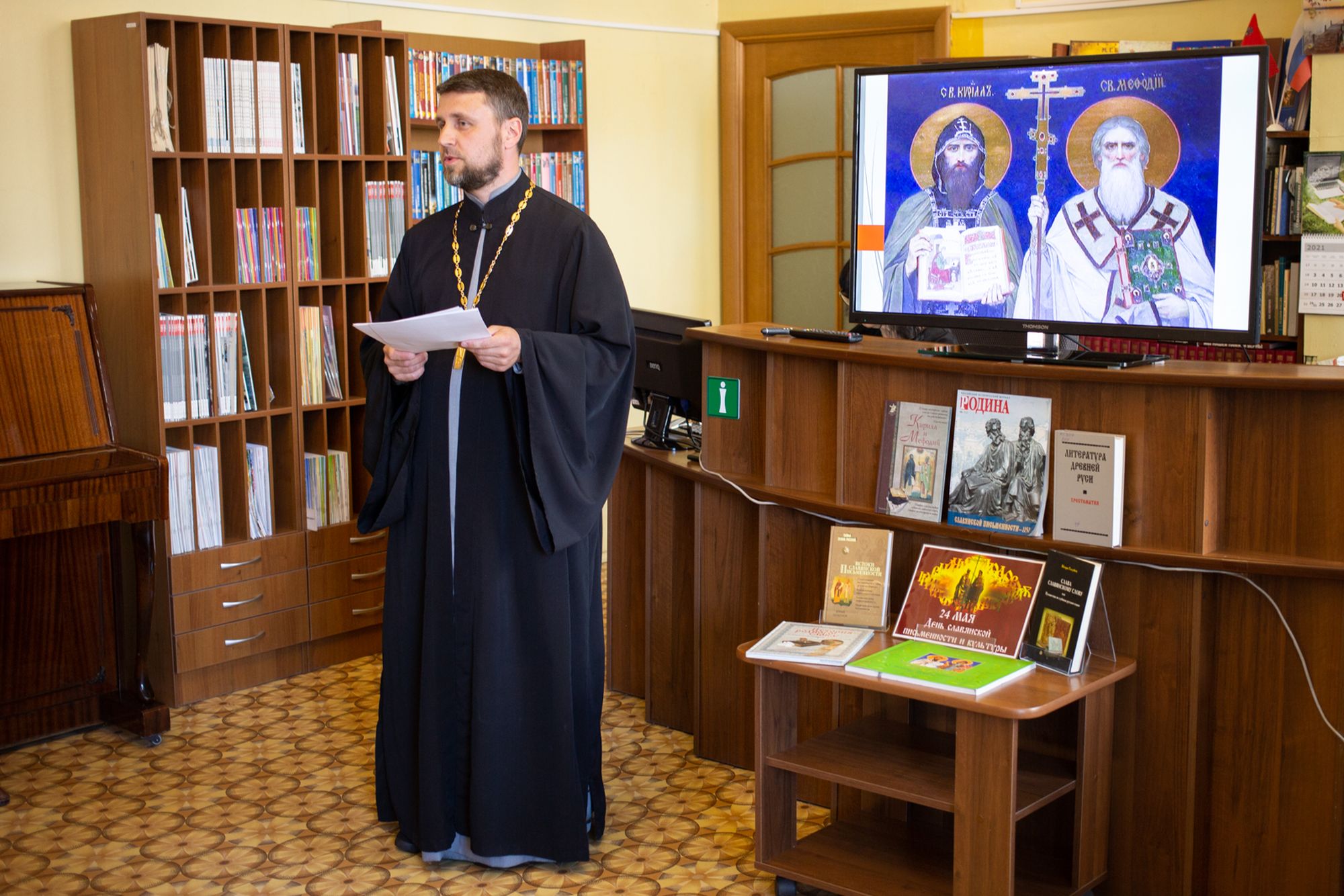 24 мая в Щёлковской центральной библиотеке состоялся исторический экскурс «Заглядывая в глубь веков». На встречу были приглашены студенты Щёлковского колледжа. Гостем мероприятия стал настоятель храма иконы Божией Матери «Спорительница хлебов» г. Щёлково священник Александр Мороков. Он рассказал об истоках праздника и провел духовную беседу, посвященную равноапостольным Кириллу и Мефодию. В завершение встречи ведущий библиотекарь Н. И. Калинина провела викторину.