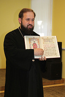 В доме культуры поселка Северный настоятель храма иконы Божьей Матери «Игуменья горы Афонской» священник Симон Абрамсон рассказал о жизненном подвиге славянских просветителей Кирилла и Мефодия и познакомил собравшихся со старинными церковными книгами.