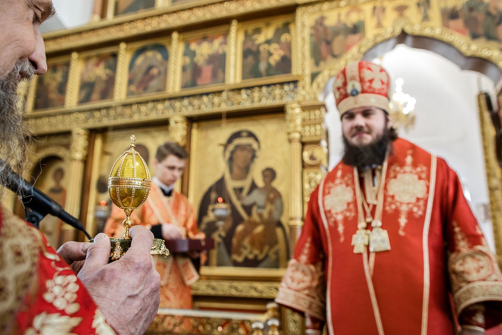 Настоятель храма игумен Иоанн поблагодарил епископа Фому за архипастырский визит и преподнес ему пасхальное яйцо ручной работы.