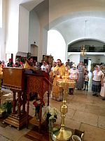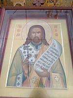 По окончании Божественной литургии настоятель протоиерей Александр Хмылов и клирик протоиерей Вадим Пирогов совершили славление перед иконой священномученика.