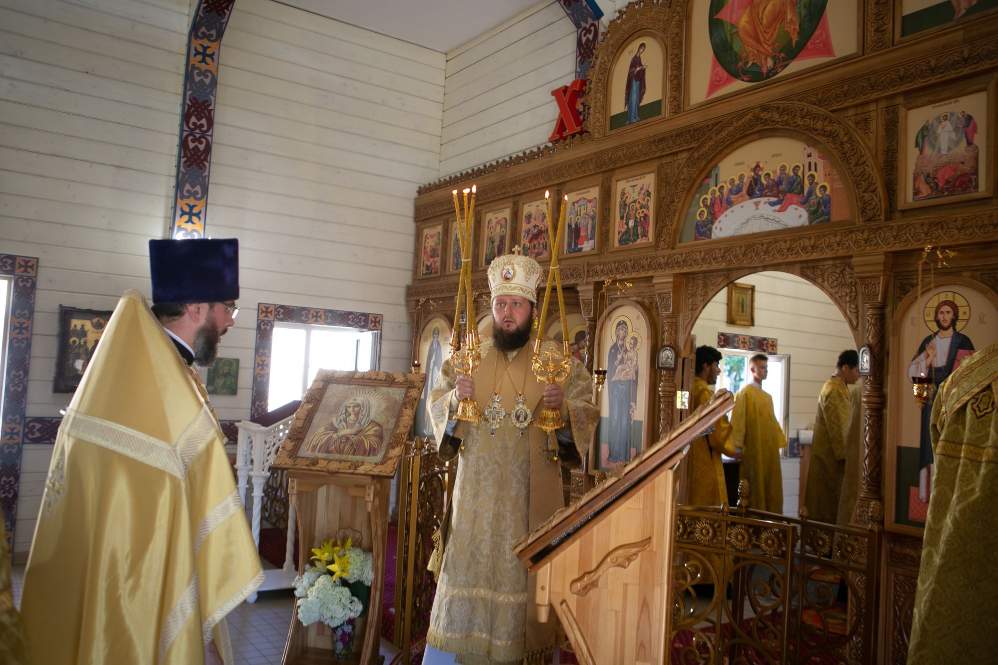 Его Высокопреосвященству сослужили благочинный Чеховского церковного округа священник Константин Александров и настоятель храма священник Симеон Волощенко.