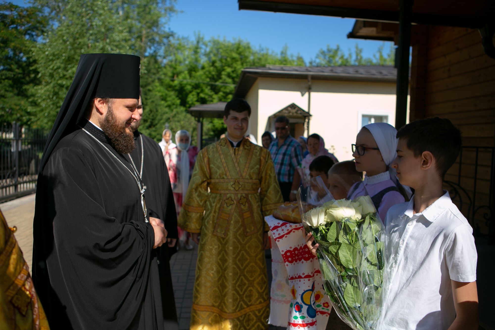 У входа в храм Владыку Аксия встретили учащиеся приходской воскресной школы.