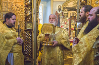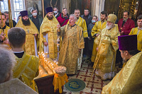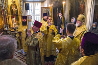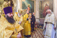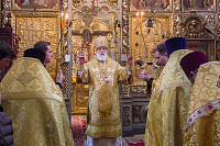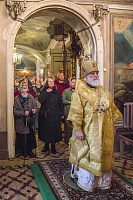 Его Высокопреосвященству сослужили: благочинный Сергиево-Посадского округа протоиерей Игорь Завацкий, настоятель Казанского храма села Шеметово протоиерей Александр Стрижак, настоятель Тихвинского храма села Большое Жоково Рыбновского района Рязанской области иерей Павел Нейгум, клирик Казанского храма села Шеметово протоиерей Иосиф Копач.