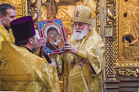 Настоятель храма протоиерей Александр Стрижак на молитвенную память передал Его Высокопреосвященству икону Казанской Божией Матери, выполненную из бисера, в традиции, которую передал своим ученикам отец Михаил.