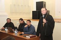 Отец Прокопий выступил с докладом на тему «Опыт сочетания духовной жизни и мужества» и ответил на вопросы студентов.