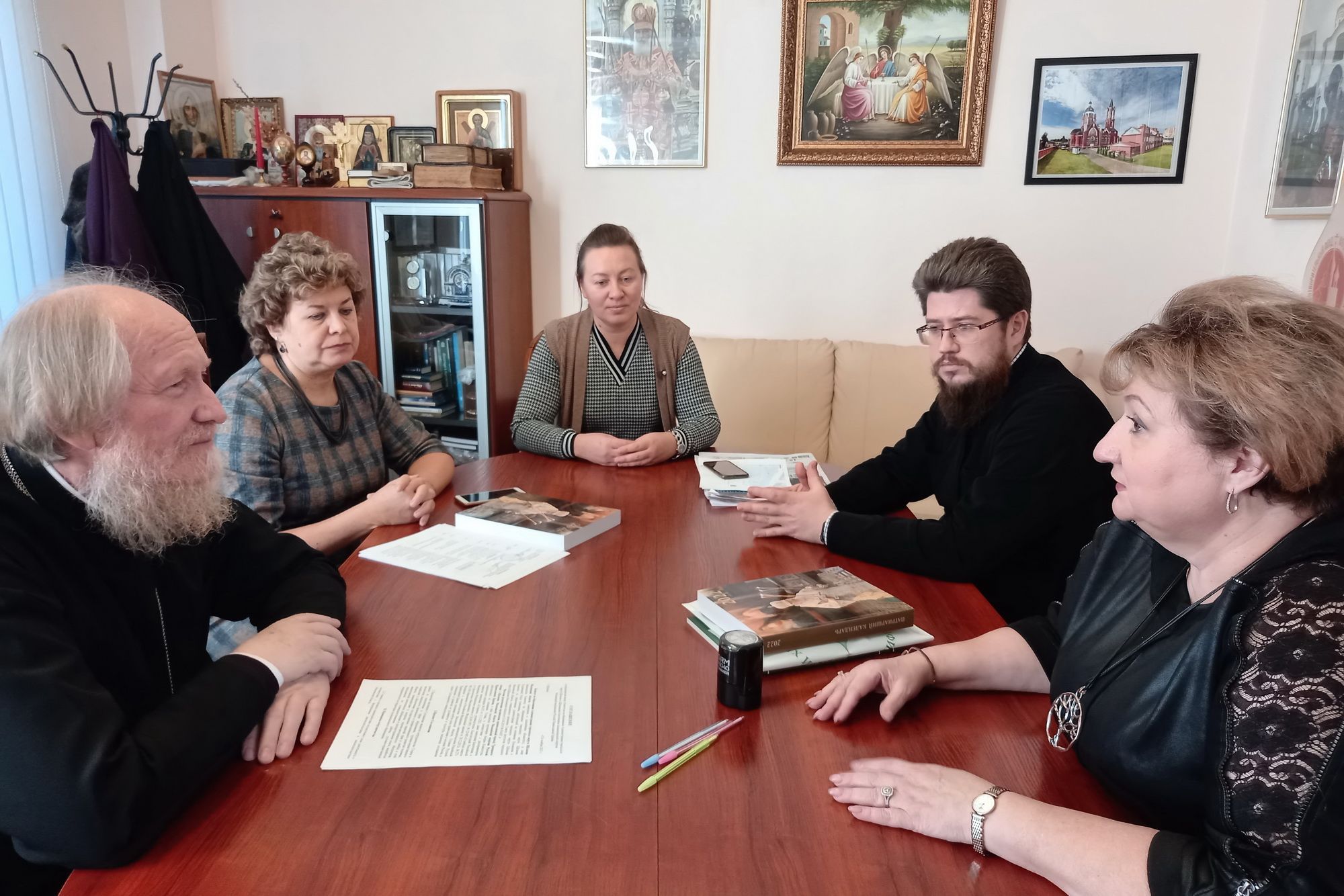 Обсуждались вопросы взаимодействия приходов благочиния с образовательными учреждениями и деятельности православных гимназий на территории городского округа. Был утвержден план совместной работы на 2022 год.