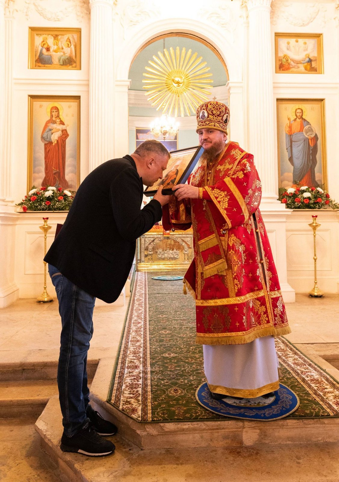 Иерей Сергий Бернацкий от лица прихода поблагодарил архиепископа Каллистрата за совместную молитву и преподнёс Его Высокопреосвященству образ священномученика Сергия Константинова.