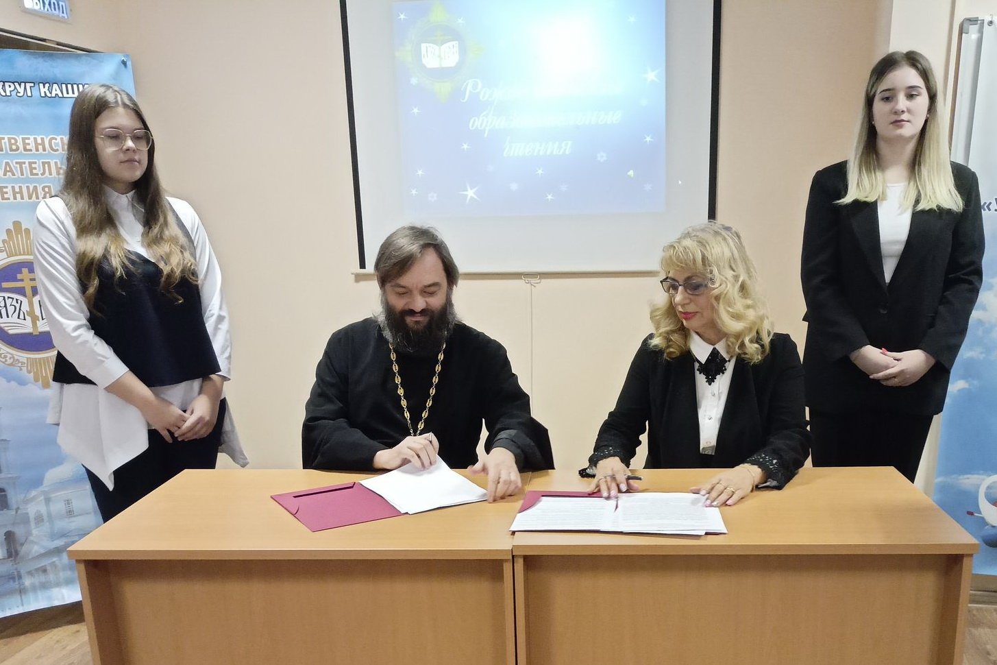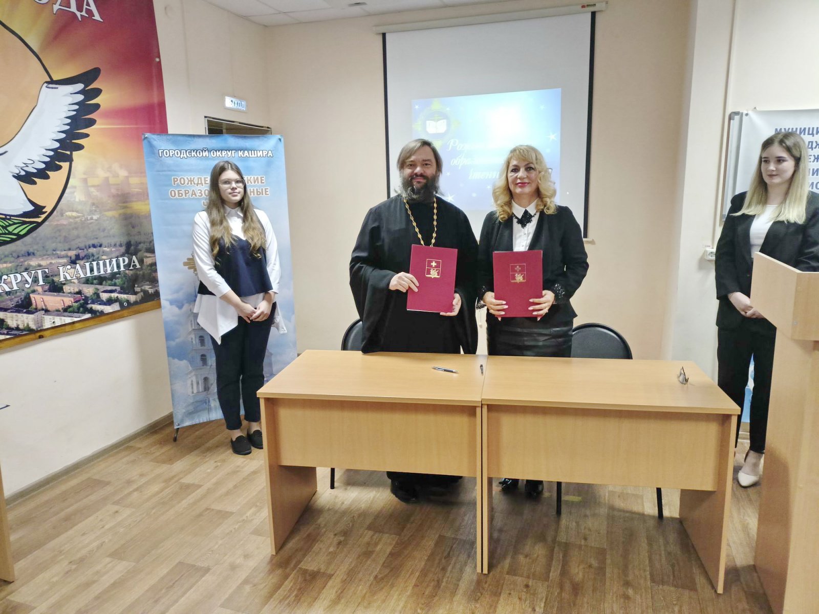 В рамках мероприятия состоялось торжественное подписание соглашения о сотрудничестве между Каширским благочинием и окружным управлением образования. Отец Валерий и Галина Николаевна обсудили планы дальнейшего соработничества, проведения совместных мероприятий и вопросы взаимодействия по реализации программ духовно-нравственного образования и воспитания.