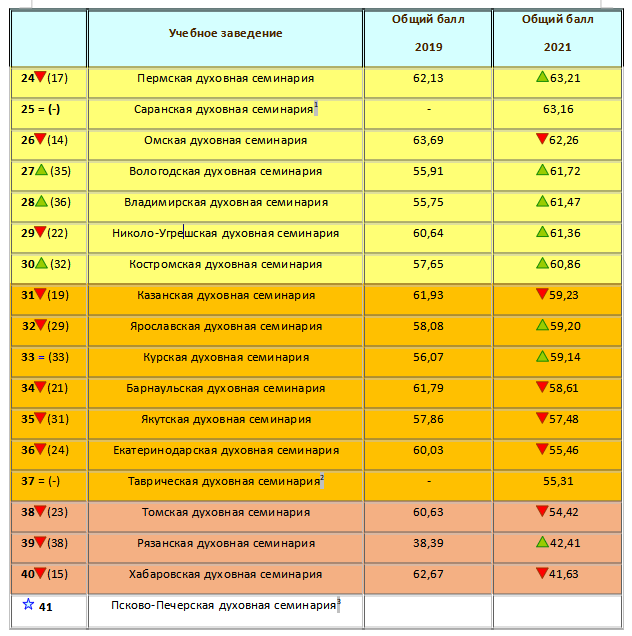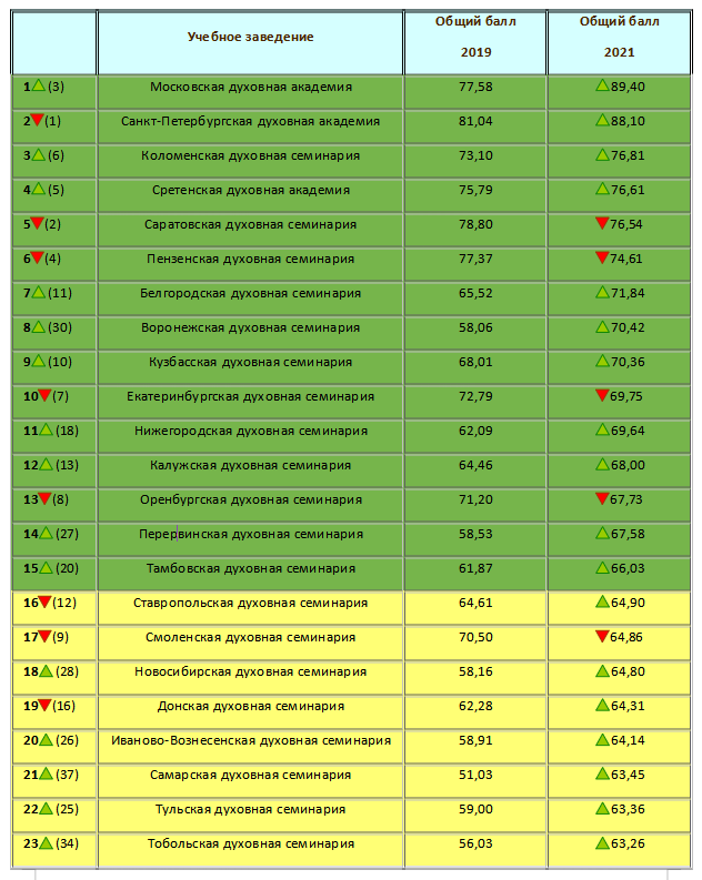 Решением Священного Синода Русской Православной Церкви (Журнал № 115 от 29 декабря 2021 года) Учебному комитету было поручено опубликовать рейтинг высших духовных учебных заведений за 2021 год.