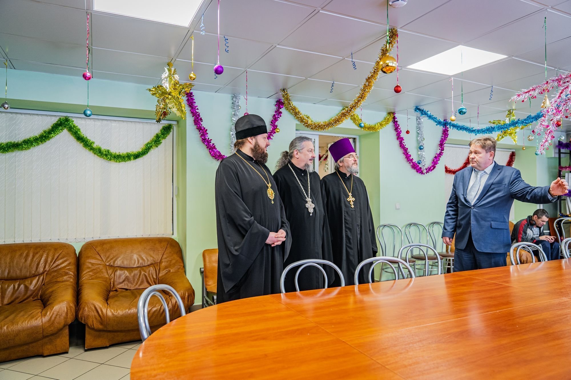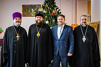 Гостей встречал директор интерната Александр Григорьевич Ханжий. Архиепископ Аксий посетил домовую церковь, где собрались прихожане. После пения тропаря Рождества Христова Его Высокопреосвященство поздравил с праздником всех присутствующих и вручил подарки.