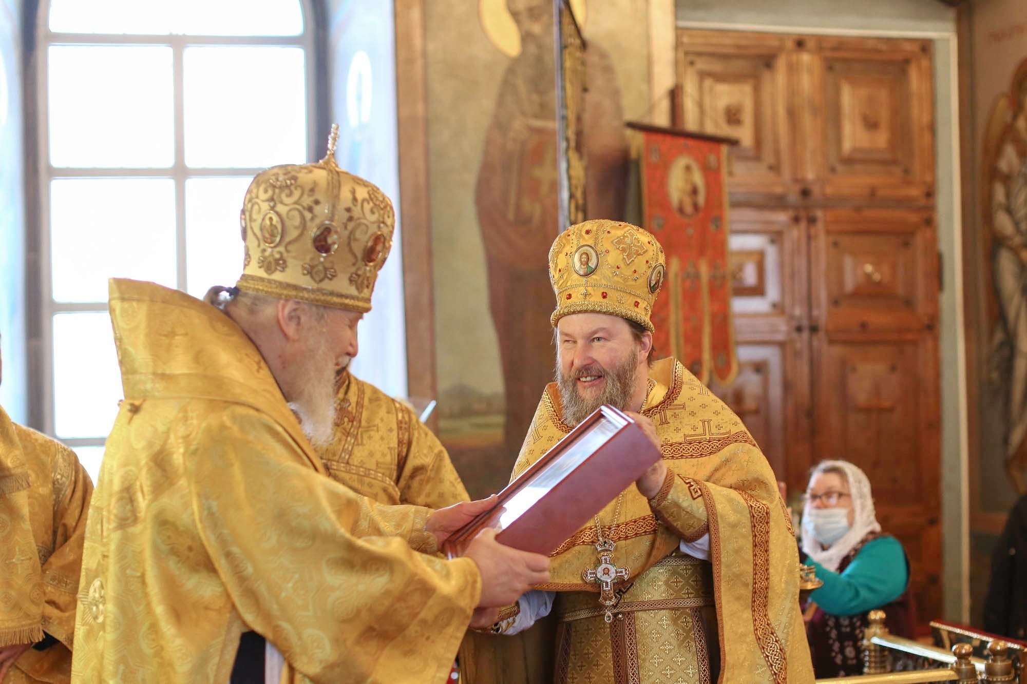 По окончании Литургии протоиерей Сергий Решетняк обратился к епископу Николаю с приветствием, поблагодарил за совершенное богослужение и преподнес ему в подарок икону святых первоверховных апостолов Петра и Павла.