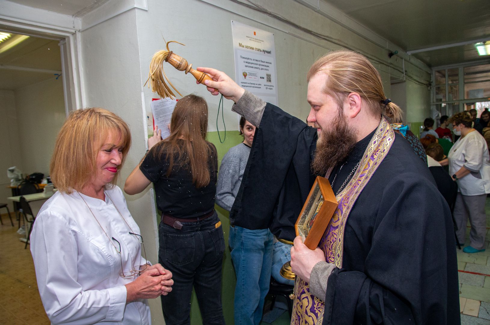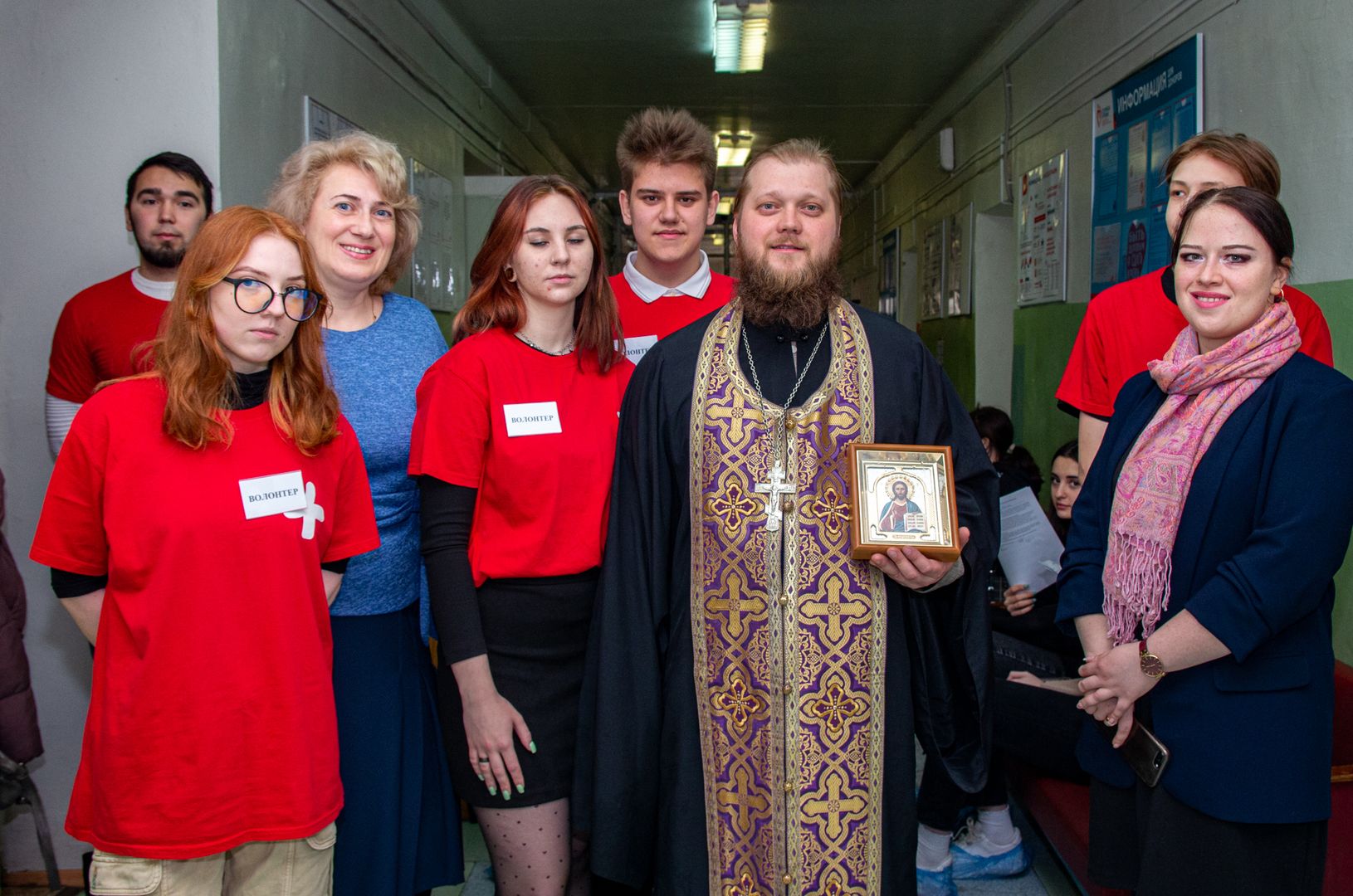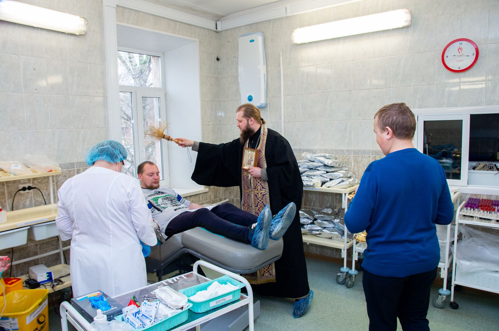 Председатель Епархиального отдела по работе с медицинскими учреждениями священник Павел Скрипник совершил молебен перед началом доброго дела, за которым молились заведующий отделением Н. Г. Горбатюк и сотрудники станции переливания крови, волонтеры-медики, преподаватели и студенты Московского областного медицинского колледжа имени героя Советского Союза З. Самсоновой, прихожане храмов Орехово-Зуевского благочиния.