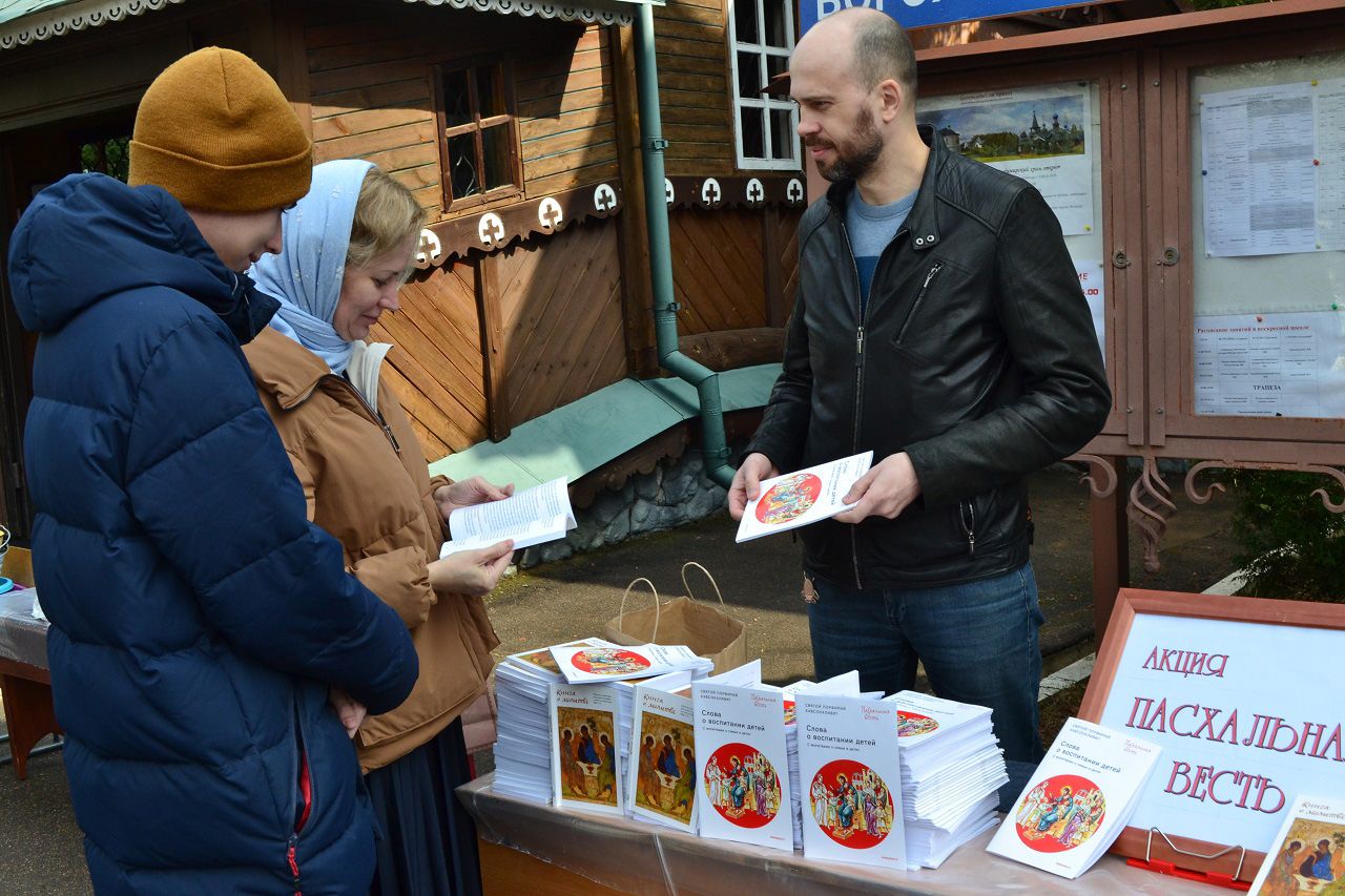 В канун Светлого праздника на многих приходах мытищинских храмов прошла акция «Пасхальная весть», благодаря которой желающие смогли получить книги о молитве и воспитании детей. Людям, пришедшим в этот день в храм для освящения пасхальной трапезы, были преподнесены в подарок книги «Родителям о воспитании детей» святого Порфирия Кавсокаливита и «Книга о молитве», которые помогут больше узнать о Христе Спасителе и научиться молиться. А на приходе храма Св. мч. Уара в Вешках православную литературу передали насельникам христианского социального дома трудолюбия «Ной», расположенного в деревне Ховрино.