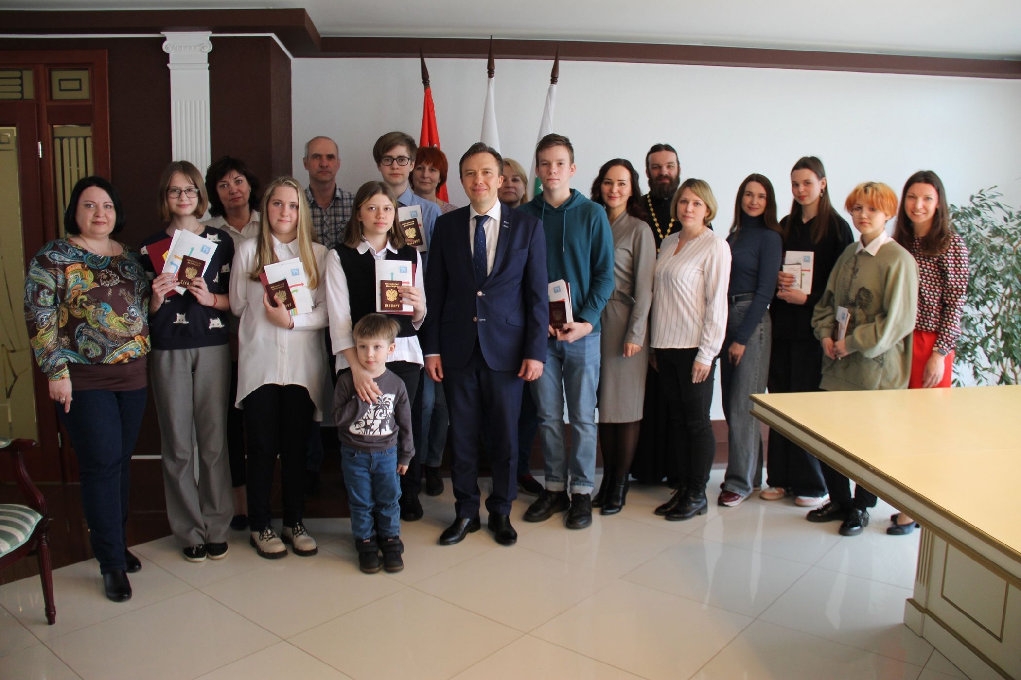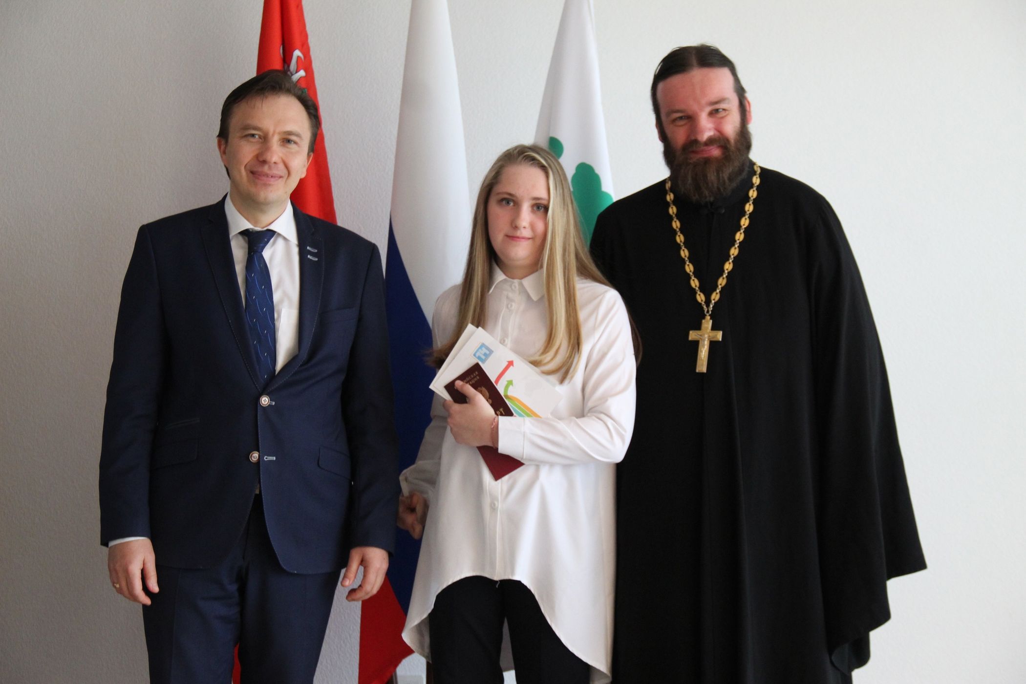 29 апреля в г. Дубне благочинный Дубненско-Талдомского церковного округа протоиерей Павел Мурзич вместе с главой г. Дубны Сергеем Куликовым и директором МФЦ Ириной Палькиной торжественно вручили первые паспорта еще семи школьникам Дубны. Отец Павел поздравил всех присутствующих со Светлой Пасхой, пожелал ребятам, чтобы в разделе паспорта "Семейное положение" стоял только один штамп, а графы раздела "Дети" были все заполнены.