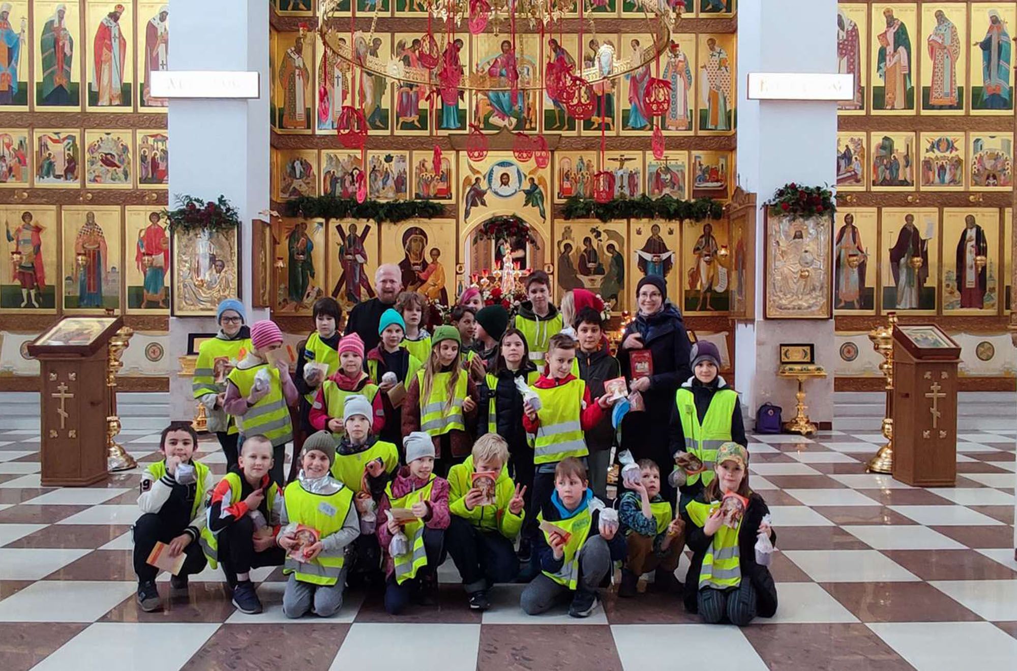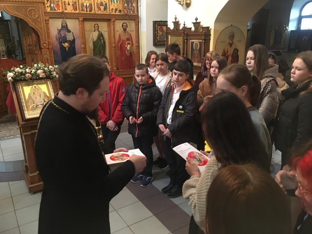 В этот же день храм блаженной Матроны Московской пос. Любимовка посетили ученики школы №22 г. Королёва. Встреча началась с экскурсии по храму, которую провел настоятель храма священник Никита Потапов. Ребята задавали вопросы о празднике Светлого Христова Воскресения, поставили свечи у икон и позвонили в колокола. Затем в актовом зале воскресной школы состоялся совместный просмотр документального фильма о Туринской плащанице. Все гости получили в подарок от батюшки книжки, написанные по наставлениям греческого старца Порфирия Кавсокаливита.