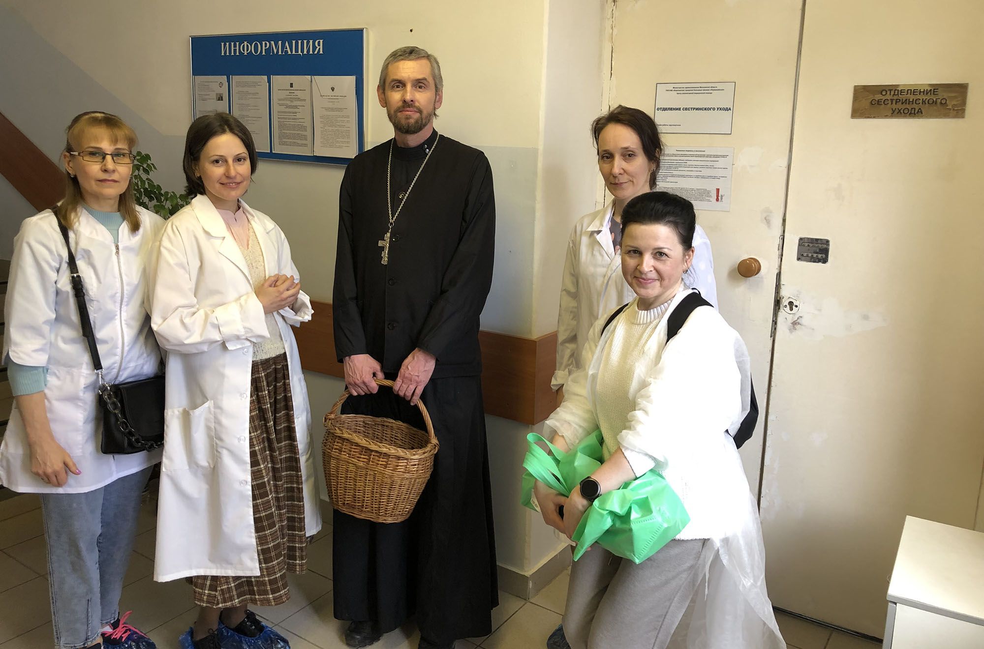 27 апреля настоятель храма Владимира Священномученика г. Королёва священник Глеб Козлов совместно с представителями волонтёрского движения Королёвского благочиния и при поддержке заместителя благочинного настоятеля Серафимовского храма г. Королёва протоиерея Александра Бекещенко поздравил с великим праздником Светлого Христова Воскресения персонал и пациентов медицинских учреждений города: отделений онкологии, неврологии, хирургии, гинекологии и кардиологии ГБУЗ МО «Королёвская городская больница» и Отделения паллиативной медицинской помощи микрорайона Первомайский. Затем вместе с волонтёрами вручили пациентам и персоналу указанных отделений небольшие подарки - освящённые яйца и куличи, Евангелия и книги по акции «Пасхальная весть». Для Отделения паллиативной медицинской помощи микрорайона Первомайский г. Королёв кроме этих небольших подарков волонтёрами были закуплены и подарены средства гигиены, памперсы, одноразовые впитывающие простыни, одноразовые бритвенные станки, йогурты, другие продукты и даже очки для одного из пациентов.