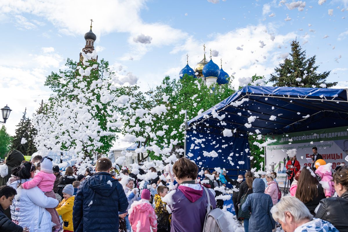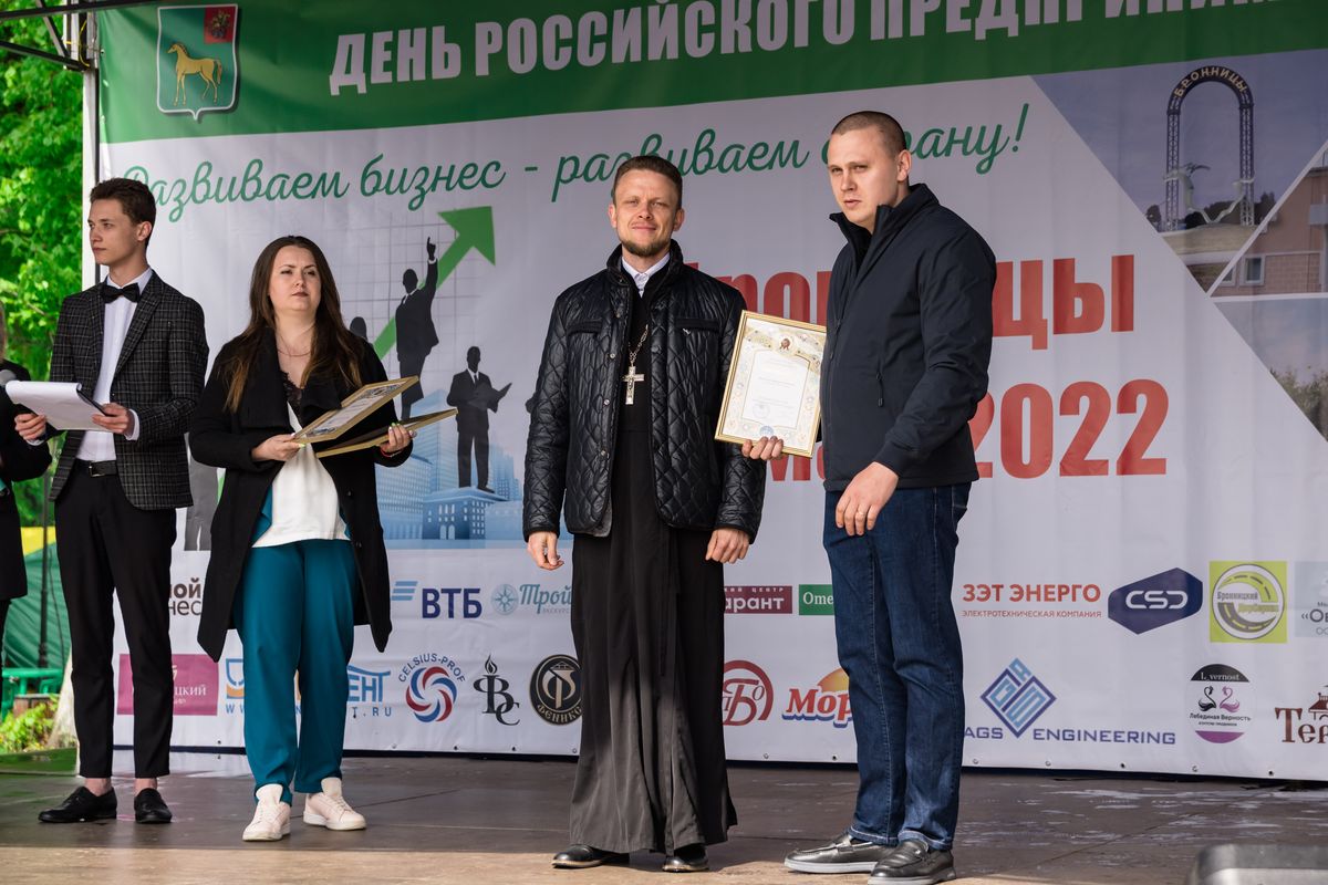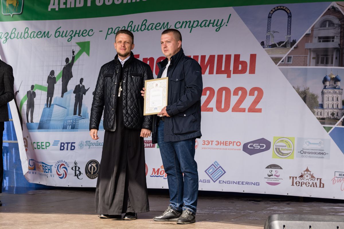 28 мая в г. Бронницы состоялся традиционный городской праздник - День предпринимателя. Местом его проведения стала площадь имени Н.А. Тимофеева, расположенная у стен Михаило-Архангельского собора. На торжественной части праздника прозвучали поздравления главы города Дмитрия Александровича Лысенкова, председателя Совета депутатов Александра Ивановича Каширина, а также благочинного 1-го Бронницкого округа иерея Сергия Себелева, который наградил благодарностью митрополита Крутицкого и Коломенского Павла гендиректора ООО «Завод вентиляционного оборудования "Инновент"» Сергея Анатольевича Дуенина и руководителей строительной организации ООО «Домок» Максима и Дмитрия Васильевых за помощь в реставрации кровли Иерусалимского храма г. Бронницы.