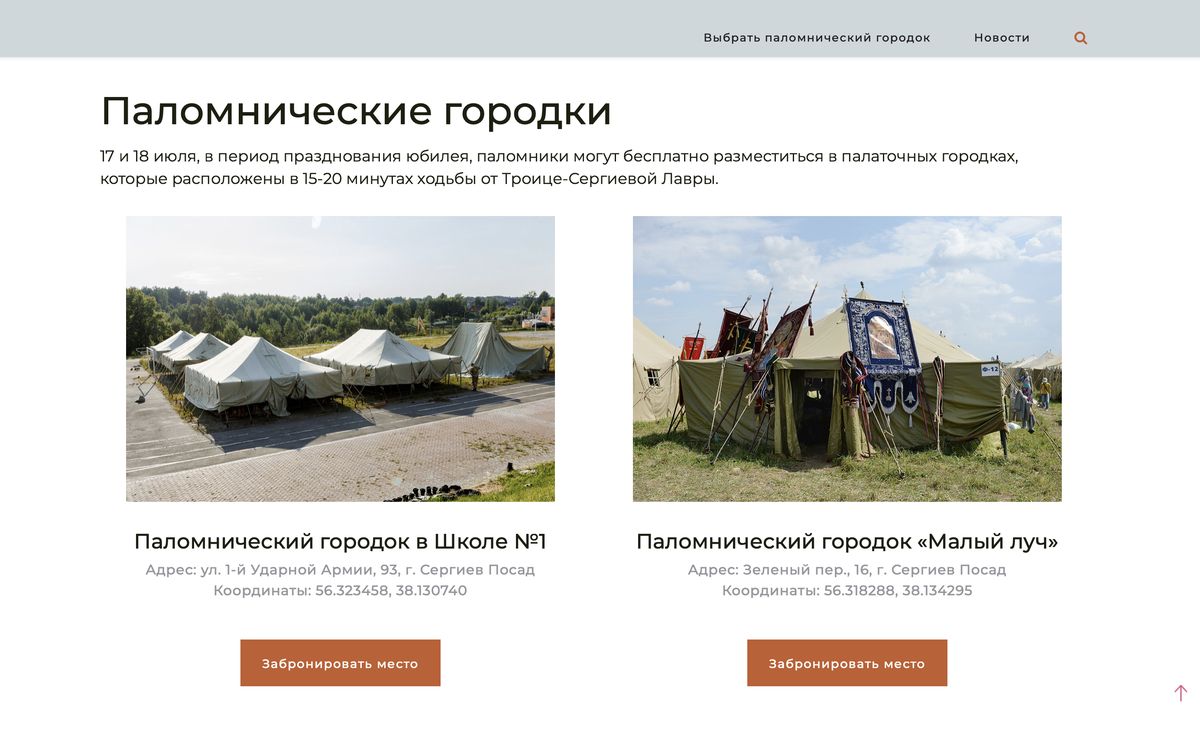 На сайте размещена информация о возможности бесплатного проживания в паломнических городках, которые расположены в 15–20 минутах ходьбы от Троице-Сергиевой Лавры: