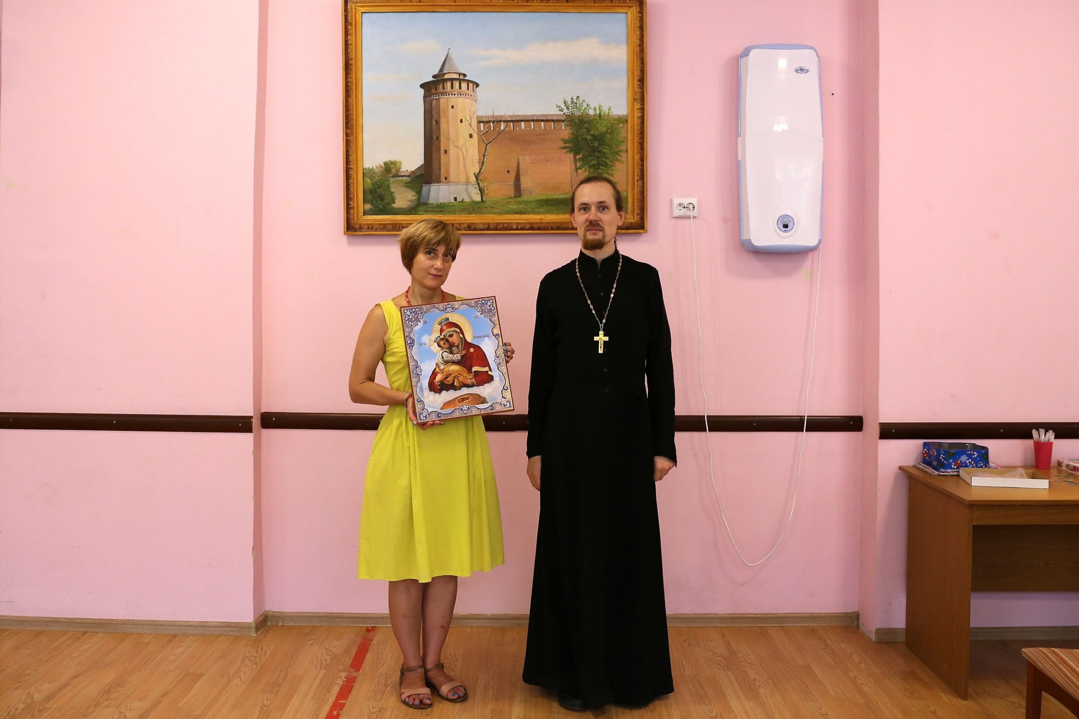 После чего иерей Иоанн побеседовал с сотрудниками, вручив в подарок учреждению икону Пресвятой Богородицы.