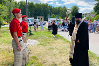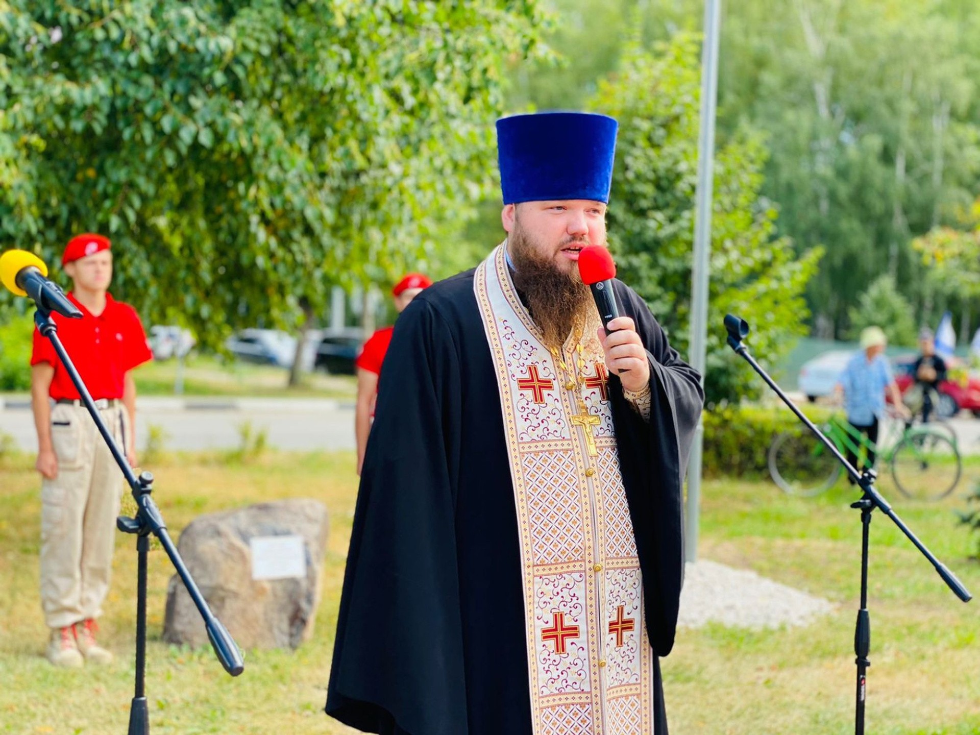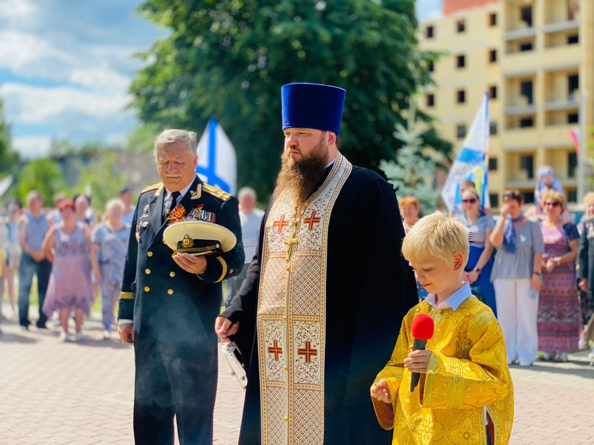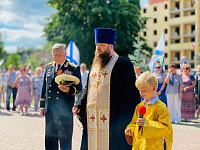 Отец Александр освятил закладной камень на месте будущего памятника ветеранам ВМФ, совершил заупокойную литию по погибшим морякам и обратился к собравшимся с приветственным словом.