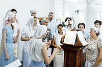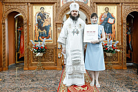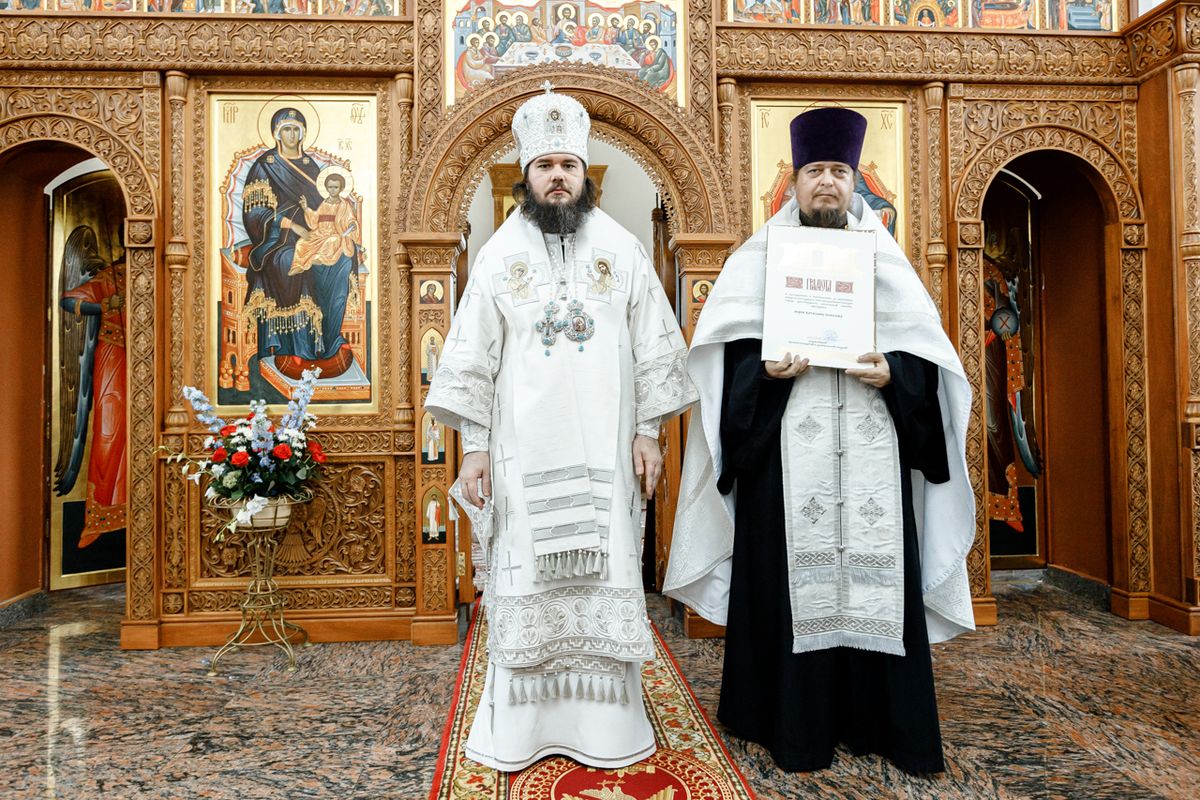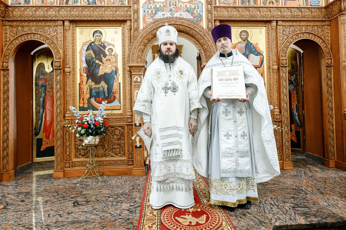 Затем Владыка поздравил общину храма с престольным праздником, пожелал всем помощи Божией в трудах и наградил Епархиальными грамотами особо потрудившихся при строительстве воскресной школы: