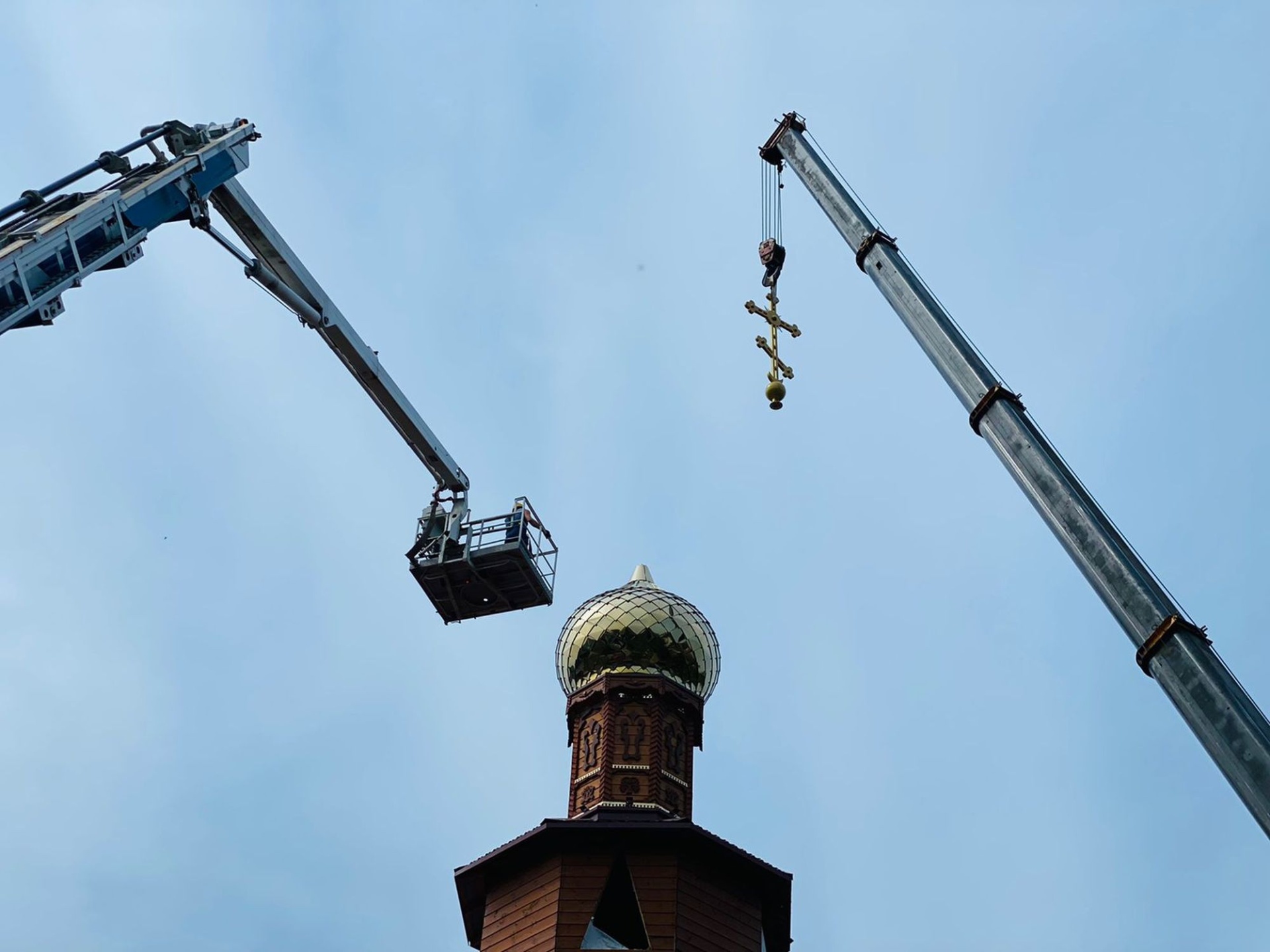 21 августа благочинный церквей Павлово-Посадского округа священник Александр Анохин совершил чин освящения новосооруженного креста на купол строящегося Богоявленского храма поселка Большие Дворы городского округа Павловский Посад.