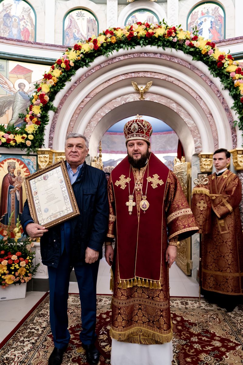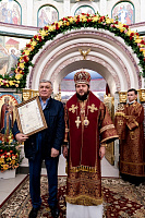Затем владыка наградил Архиерейскими грамотами благотворителей, которые внесли особый вклад в строительство храма.