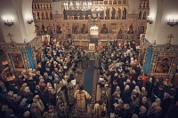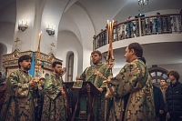 После сугубой ектении Владыка вознёс молитвы о Святой Руси и о здравии Святейшего Патриарха Московского и всея Руси Кирилла.