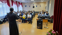 Иерей Роман, используя активные методы взаимодействия, провёл беседу «100 вопросов священнику». Современные темы дня рассматривались сквозь призму православия. После завершения разговора дети еще долго задавали вопросы, делились впечатлениями, эмоциями. Учащиеся попросили священника о продолжении встреч.