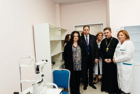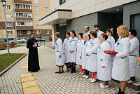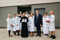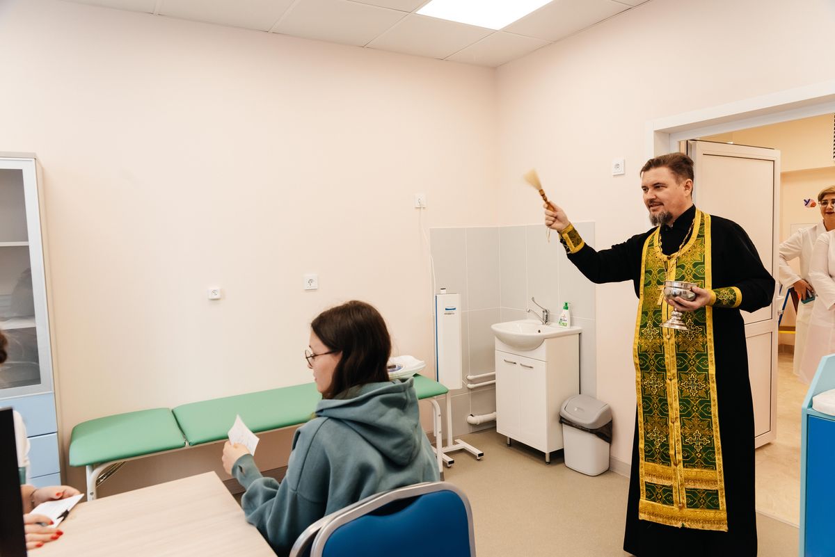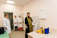 Заместитель благочинного церквей Пушкинского округа иерей Тимофей Князев совершил чин освещения помещений и передал в благословение на грядущие труды иконы Спасителя и Божией Матери заведующей амбулаторией А.М. Сарухановой.