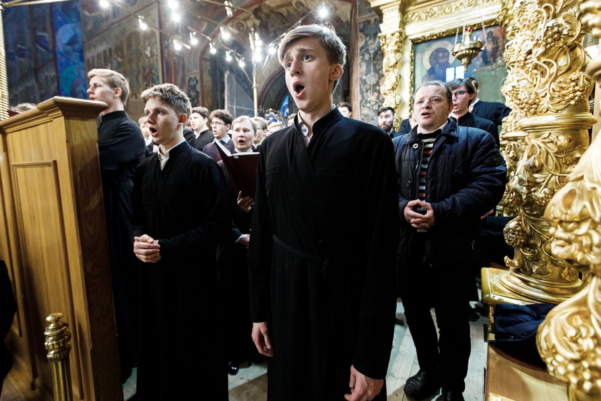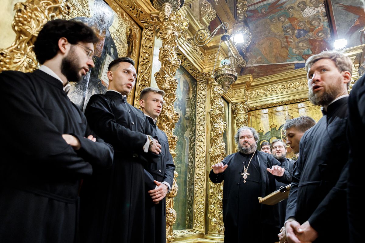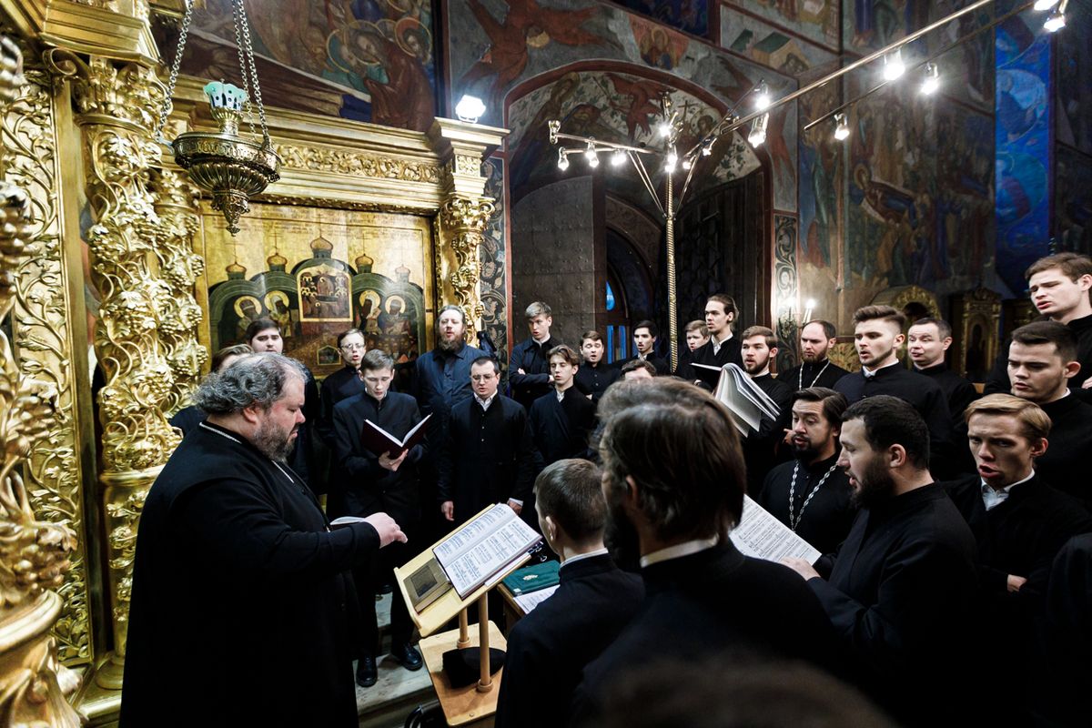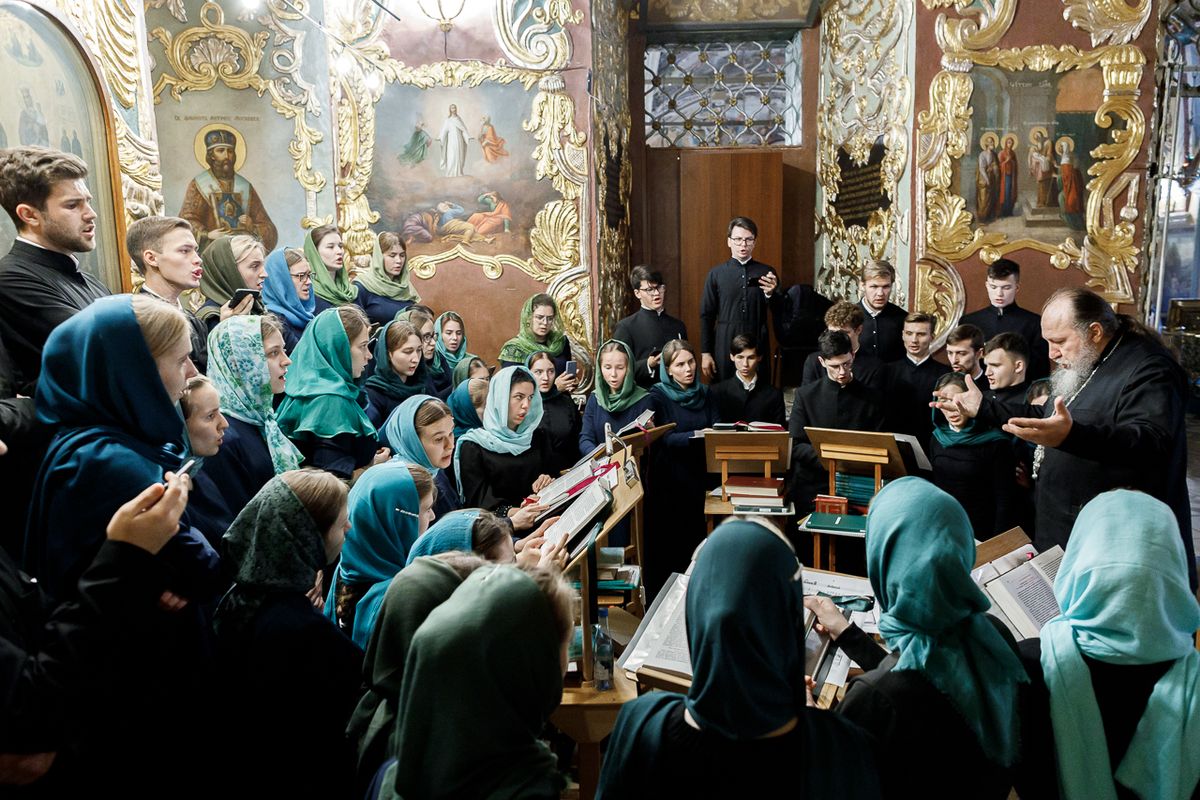 За Литургией в Успенском соборе песнопения исполнили: справа — мужской хор под управлением иеромонаха Нестора (Волкова), слева — мужской хор под управлением чтеца Владислава Пилюгина. За молебном пел хор под управлением иеромонаха Нестора (Волкова).
