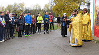 Маршрут пролегал по территории прихода Страстного храма деревни Артемово, который начался с молебна. По окончании богослужения отец Феофан обратился к участникам пробега с напутственным словом, благословил и окропил всех святой водой.