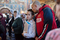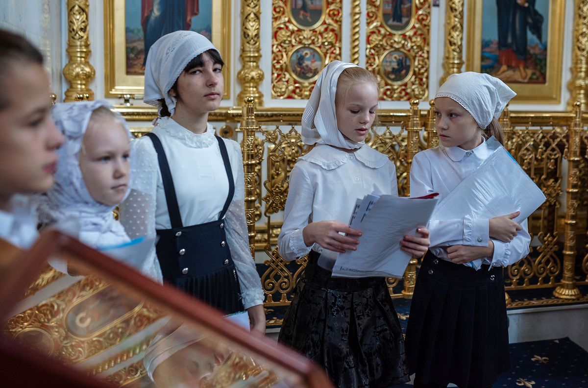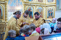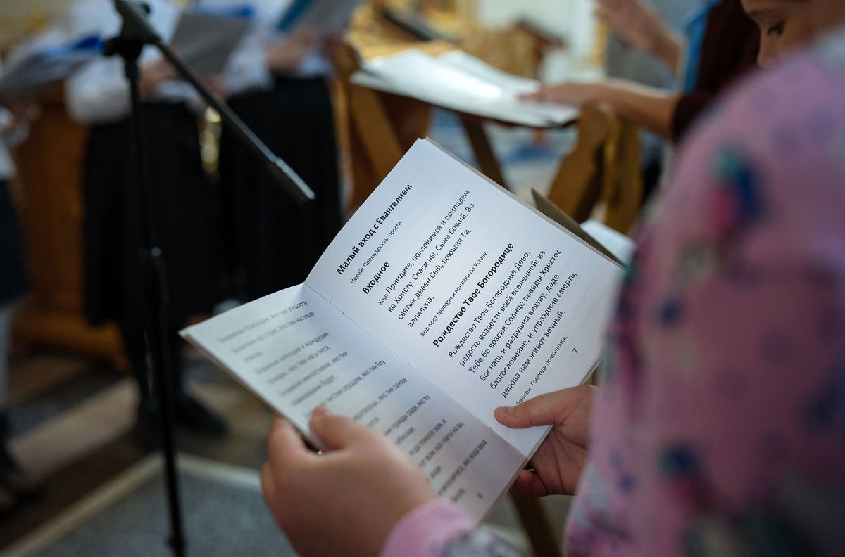 В Литургии приняли участие воспитанники воскресной школы при Богородицерождественском храме, которые к этому дню сделали специальные книжечки с текстом богослужения, чтобы следить за словами священника и самим молитвенно принимать участие в Литургии.