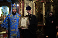 Затем владыка поздравил протоиерея Сергия Ефимова с 50-летием со дня рождения и 20-летием иерейской хиротонии и вручил за усердные труды Архиерейскую грамоту.