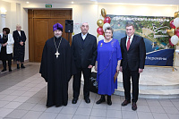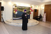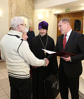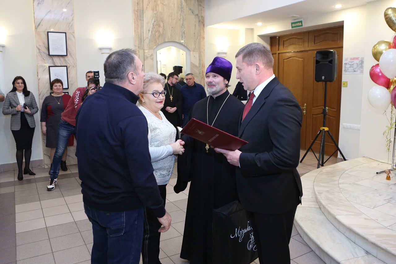 Отец Андрей и Владислав Юрьевич тепло приветствовали семейные пары и преподнесли им памятные адреса и ценные подарки. Поздравления юбиляров сменялись концертными номерами, подготовленными артистами театра "Город". Всего на празднике поздравили 39 пар.