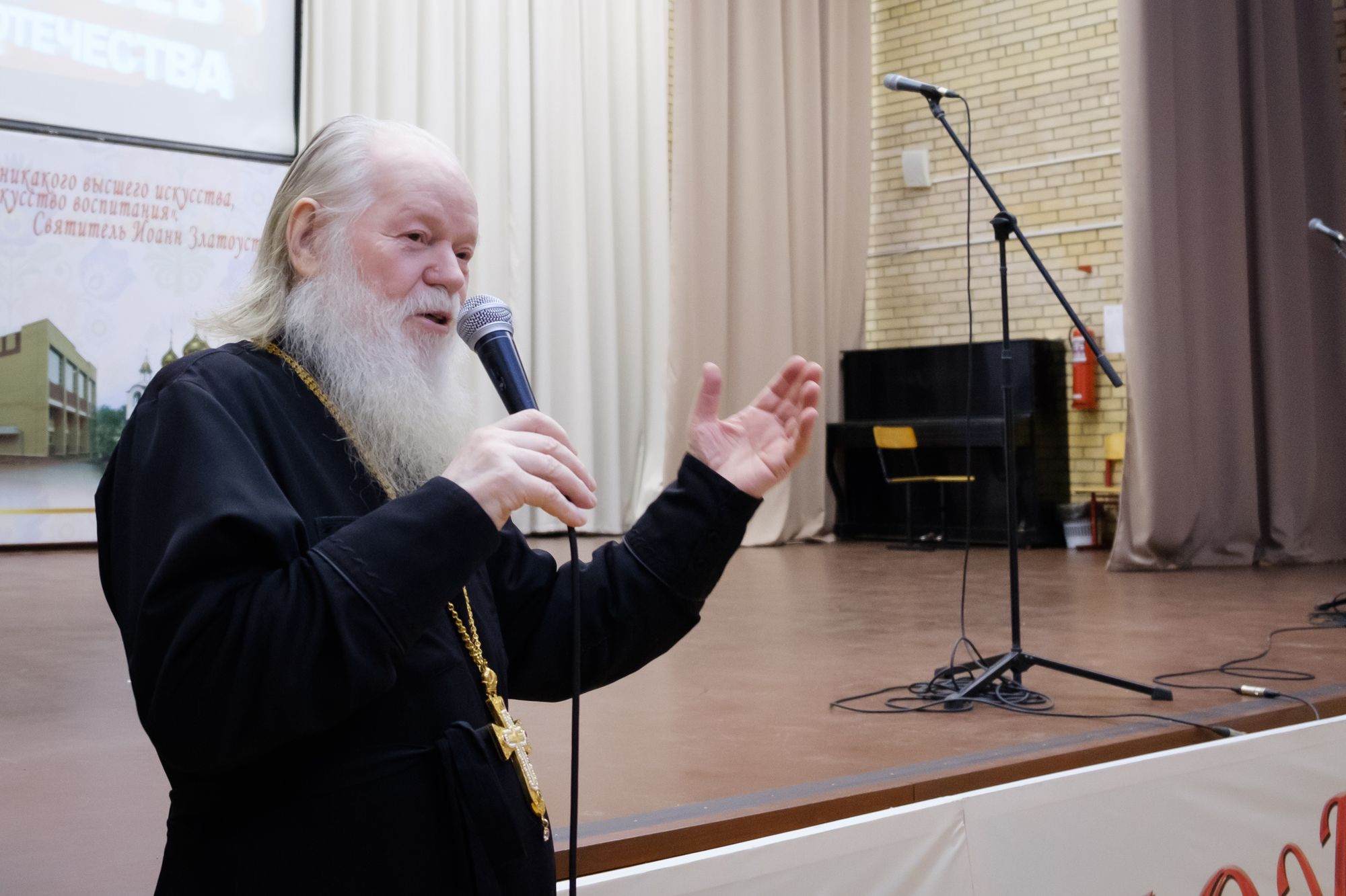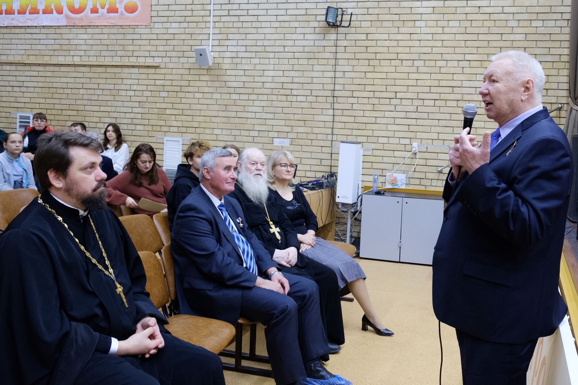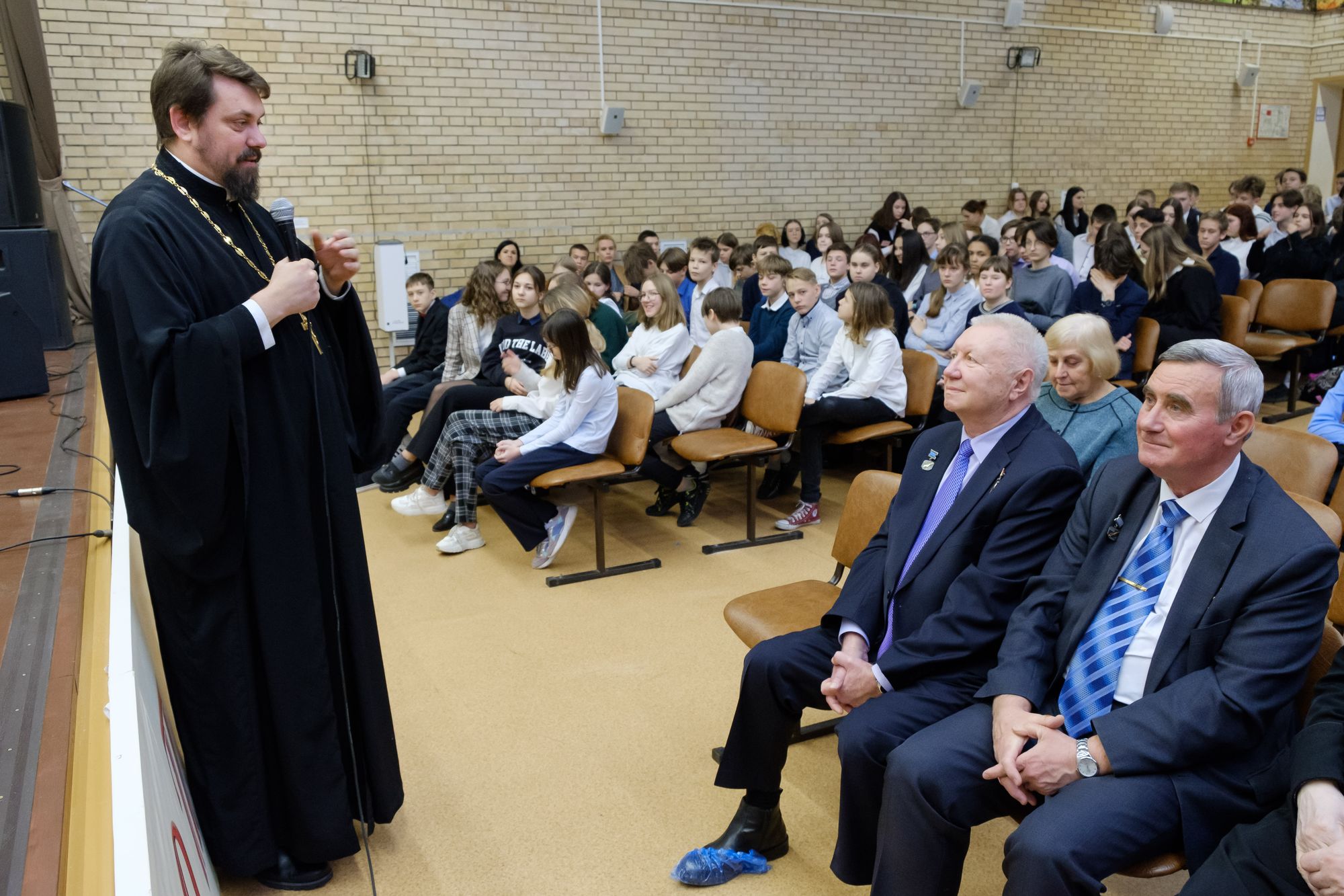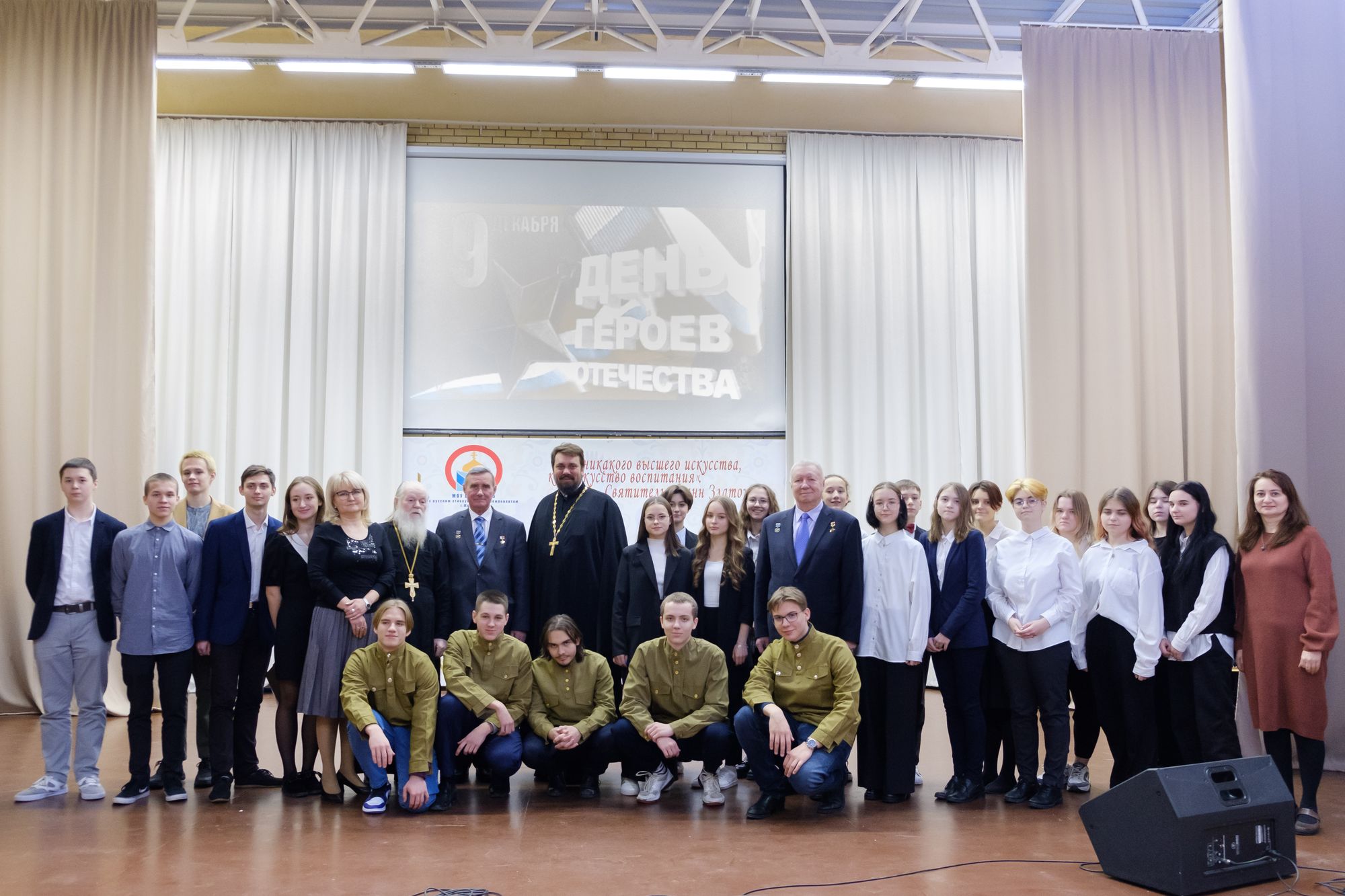 Героев и гостей встретили аплодисментами. Благочинный Жуковского церковного округа иерей Димитрий Денисов поздравил присутствующих с праздником Днём Героев Отечества и вспоминал, как к ним в класс часто приходили ветераны и Герои, которые рассказывали о своих подвигах. Почетный настоятель Пантелеимоновского храма протоиерей Николай Струков поздравил всех с праздником и сказал школьникам очень мудрые слова: «Встреча с Героями символична. Мы сейчас как никогда понимаем, что самое главное – это воспитание подрастающего поколения. Можно окончить три института, быть доктором наук, но самое главное - нужно быть человеком! Когда спросили ученого Павлова кем ты хочешь, чтобы стал твой сын? Он сказал, что человеком! Такой нет специальности. Есть физики, химики, конструкторы и т. д. Нет, самое главное нужно быть человеком! У каждого должно быть самосознание. Что я сделал для семьи, для города, для Родины? Держать отчёт перед собой, перед своей совестью. Потому, что мы воспитываемся и в школе, и на улице, и в интернете. Мы можем себя воспитать и сказать нравственный человек, высоко нравственный! А внутри подлец. А надо быть человеком духовно нравственным, ответственным перед людьми, перед своей семьёй, перед Богом. Ещё Александр III говорил: «Укрепляйте семью, потому что семья основа государства».
