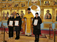 25 декабря после Божественной литургии в Иерусалимском храме г. Воскресенск состоялось награждение призеров конкурса детского творчества «Красота Божьего мира». В этом году почетные места заняли три участницы из городского округа Воскресенск. Войнова Валерия получила 3-е место в номинации «Основная тематика» за художественную работу «Святой Сергий Радонежский». Провкина Таисия и Волкова Виктория заняли 3-е места в номинации «Роспись по фарфору» за работы «Преподобный Сергий. Труды в пекарне» и «Варфоломей читает Святое Писание» соответственно. Благочинный 1-го Воскресенского округа протоиерей Сергий Якимов поздравил награждаемых и вручил им грамоты.