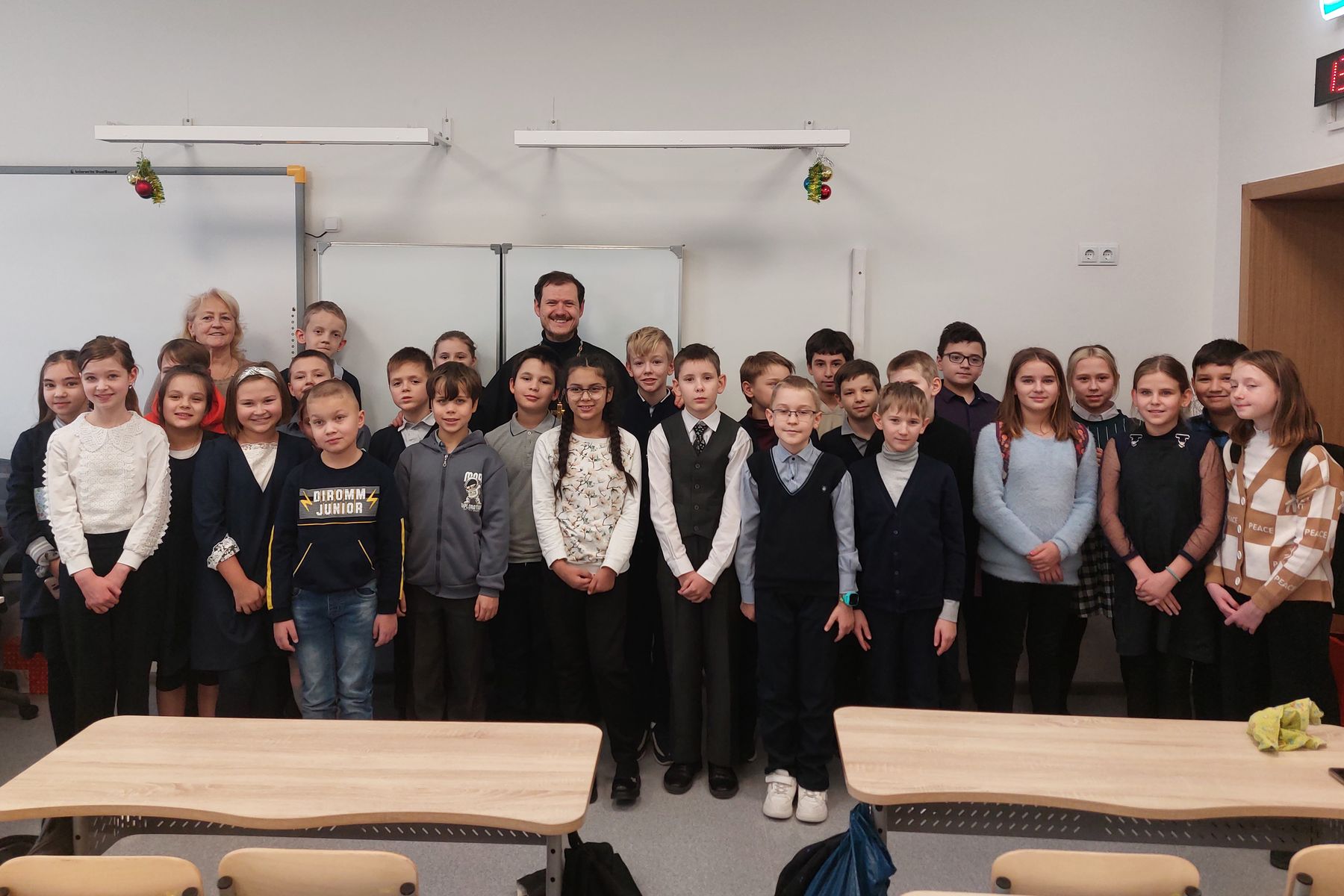 26 декабря настоятель Богородицерождественского храма посёлка Образцово священник Димитрий Выдумкин провёл урок, посвящённый наступающим праздникам, в Краснознаменской школе городского округа Щёлково. Батюшка рассказал об истории рождественской ели, о традициях празднования Рождества Христова в России и ответил на вопросы слушателей.