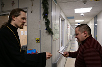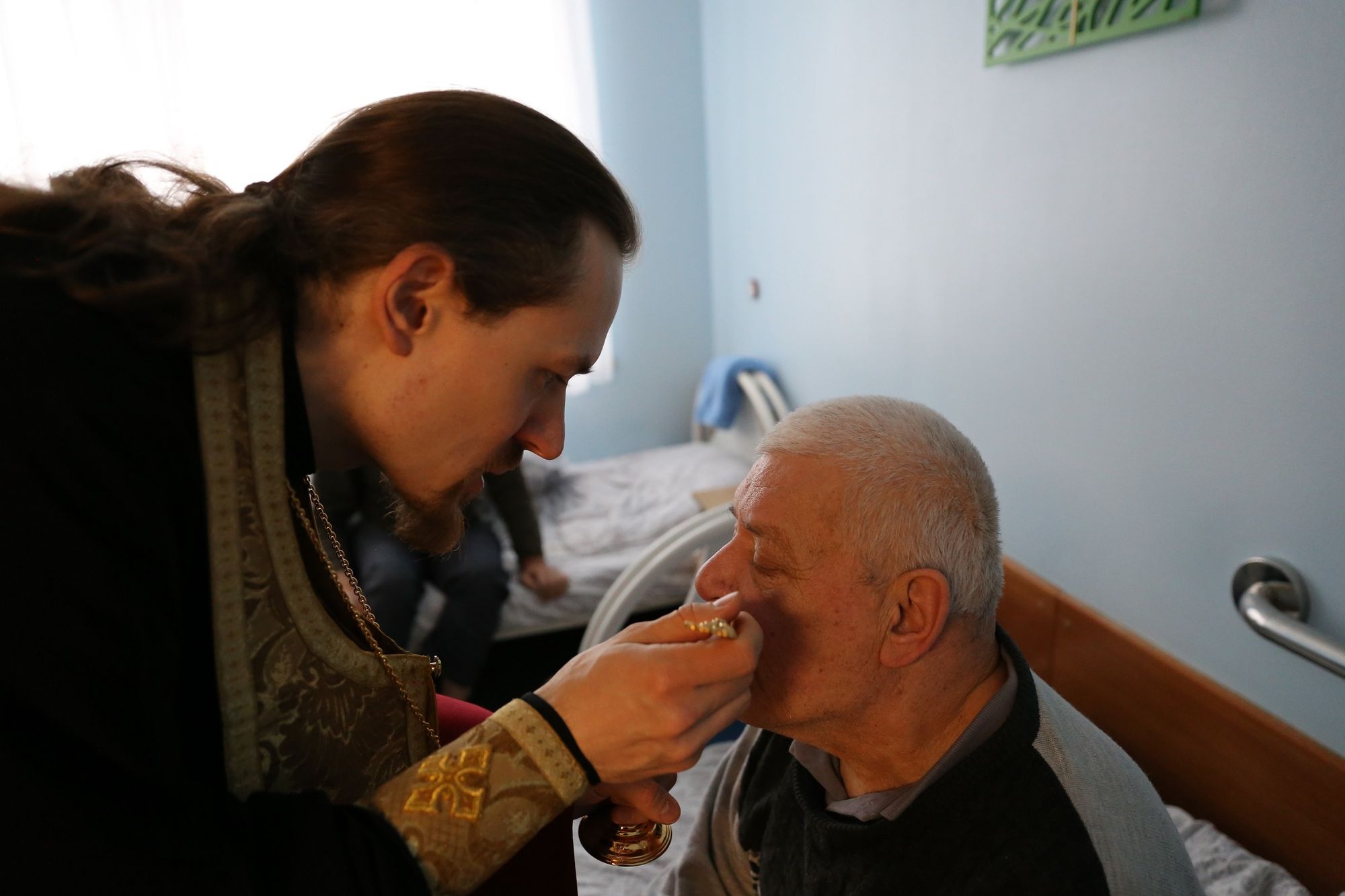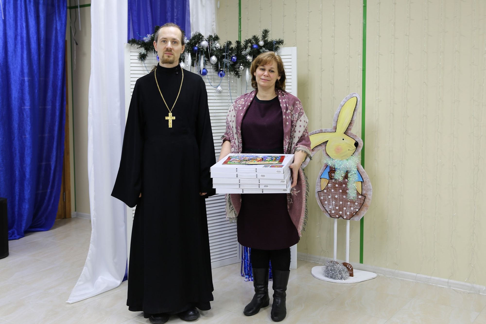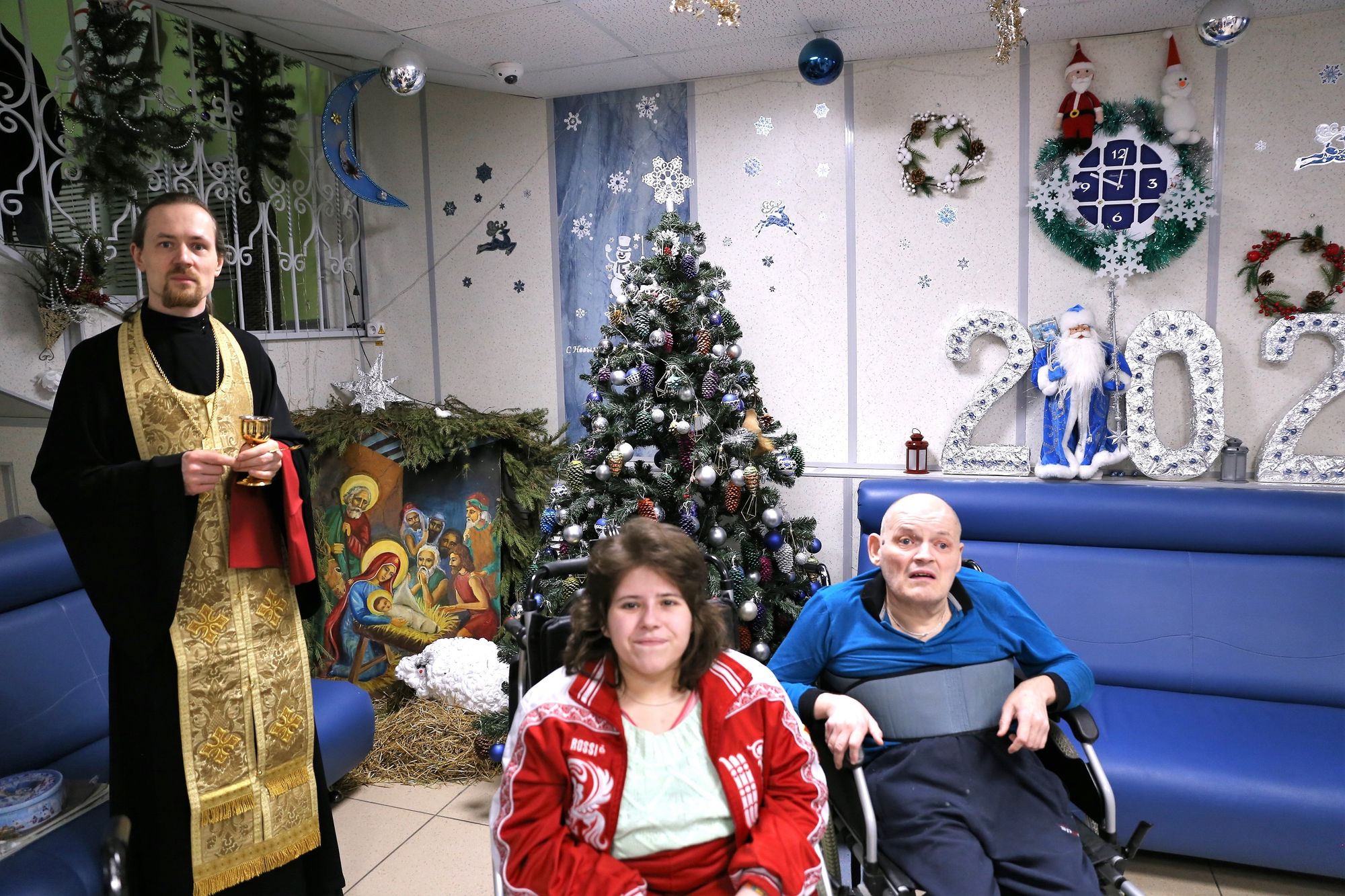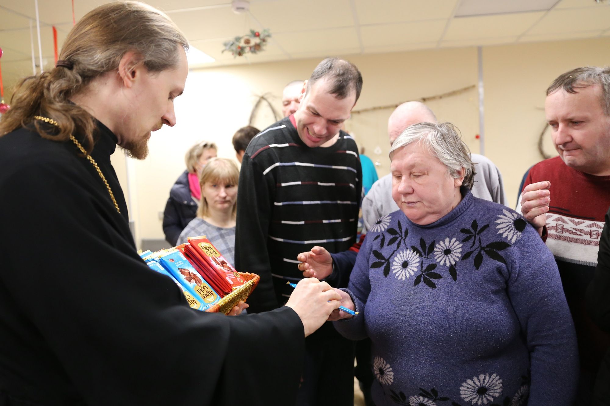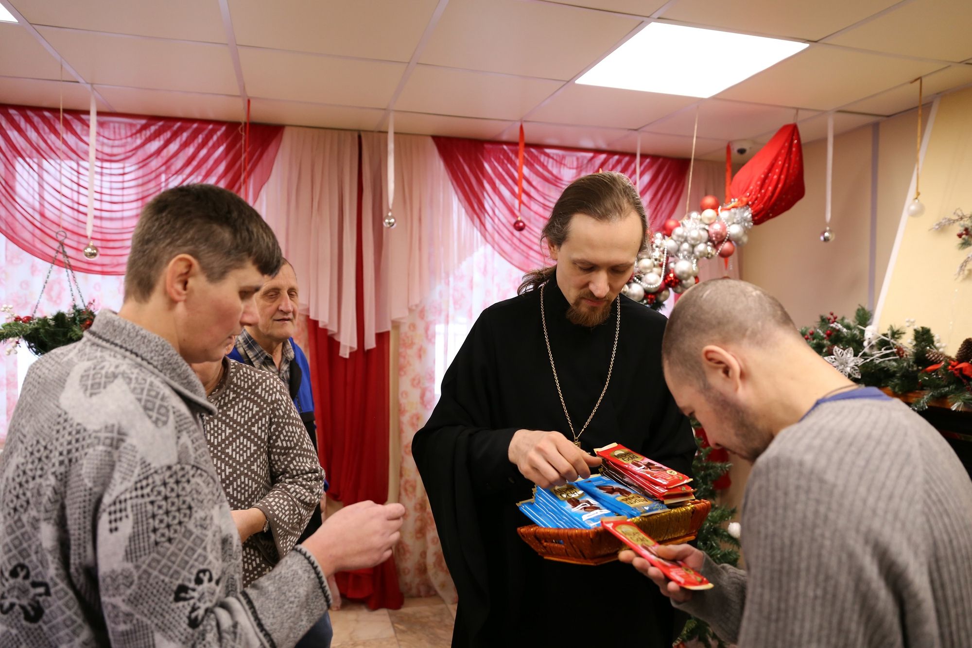 Иерей Иоанн посетил проживающих в комнатах, беседуя и совершая Таинство Причастия всех желающих. Затем иерей Иоанн поздравил проживающих в интернате с Рождеством Христовым, вручив по шоколадке. Также руководителю кружковой работы интерната были переданы наборы для творчества.