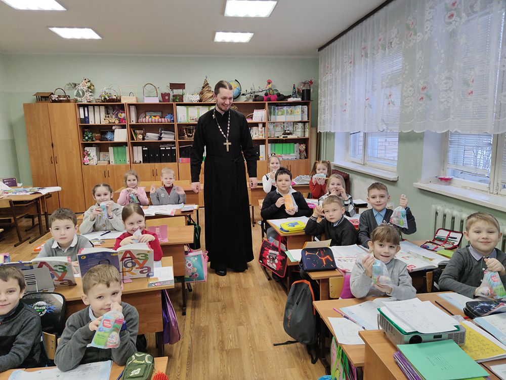 10 января настоятель Знаменского храма села Непецино священник Константин Баранов Непецинскую СОШ, поздравив первоклассников с Рождеством Христовым. Также юным ученикам были подарены сладости.