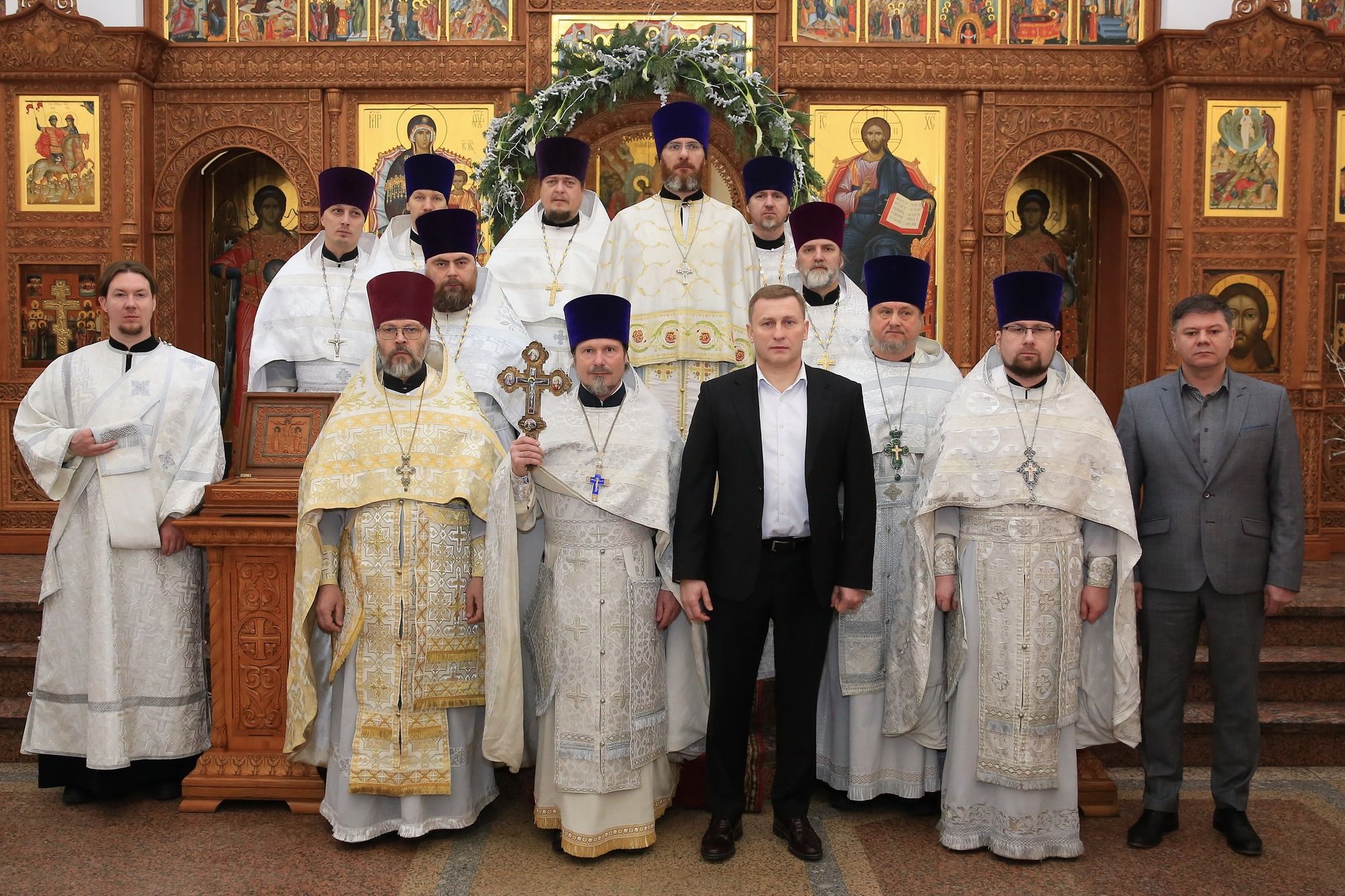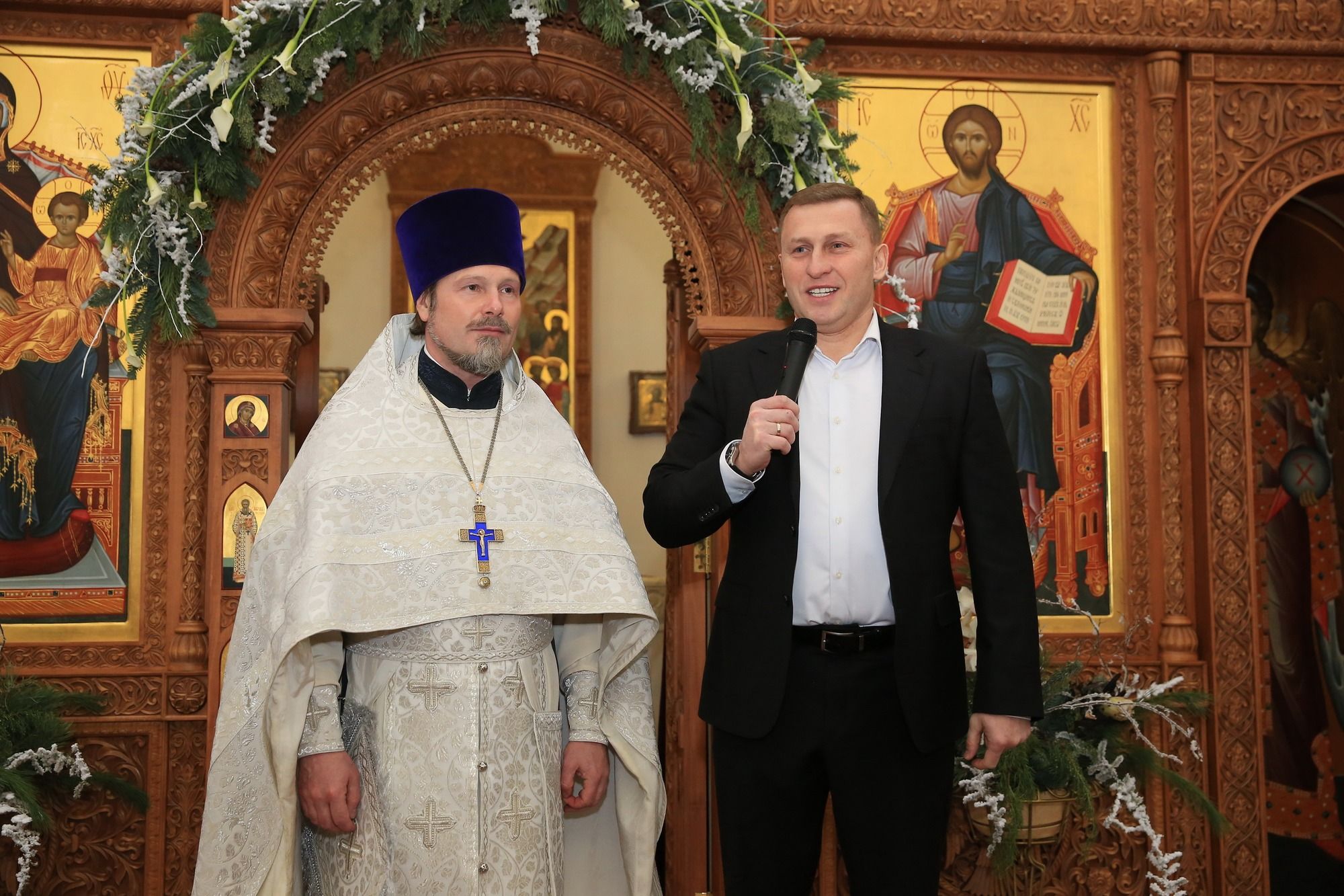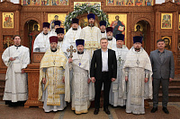 По завершении славления празднику заместитель благочинного, настоятель Георгиевского храма г. Долгопрудный протоиерей Александр Суворкин поздравил отца Андрея с Рождеством и наступающим Новолетием. Затем отец благочинный и Глава города обменялись праздничными приветствиями. Владислав Юрьевич поблагодарил духовенство за активное участие в жизни городского округа и существенный вклад в патриотическое воспитание горожан.