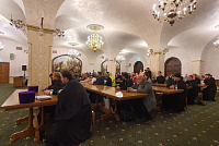 В заключительной части встречи В.Р. Легойда ответил на ряд актуальных вопросов: об освещении деятельности священнослужителей, занимающихся пастырским окормлением военнослужащих в зоне проведения СВО, о миссии священнослужителей в социальных сетях и новых форматах взаимодействия с аудиторией и др. Кроме того, участники мероприятия поделились собственным опытом и озвучили свои предложения по вопросам взаимодействия с Отделом.