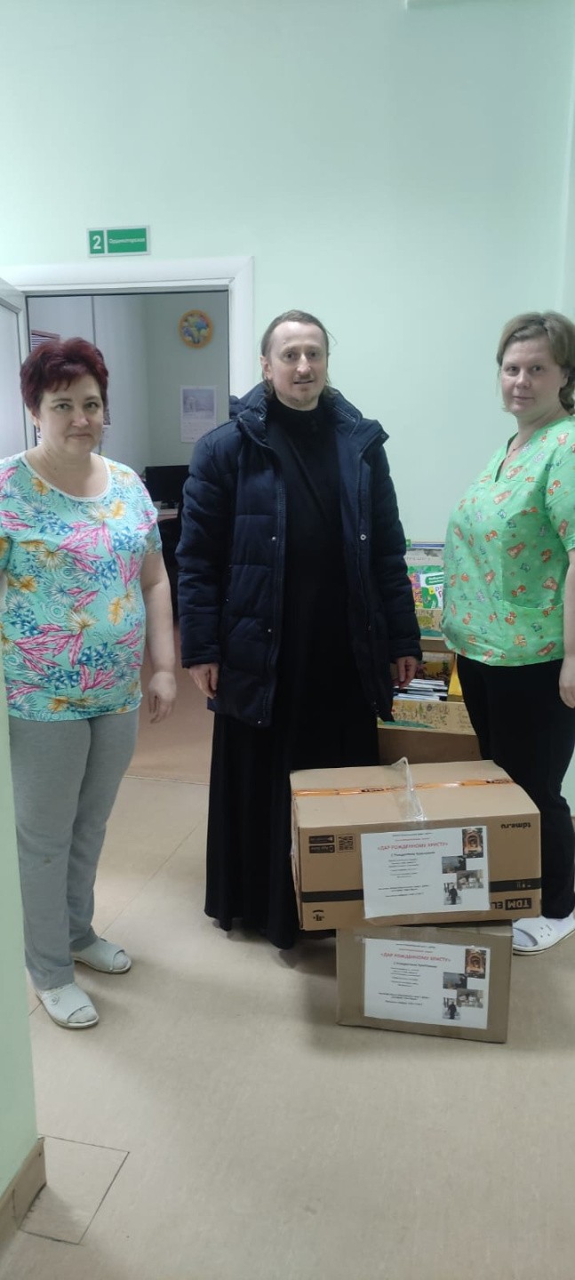 5 февраля подарки получили маленькие пациенты в детском отделении Дубненской городской больницы. Коробки с подарками туда доставил священник Павел Некрасов. Из-за санитарных ограничений подарки раздавал медицинский персонал.