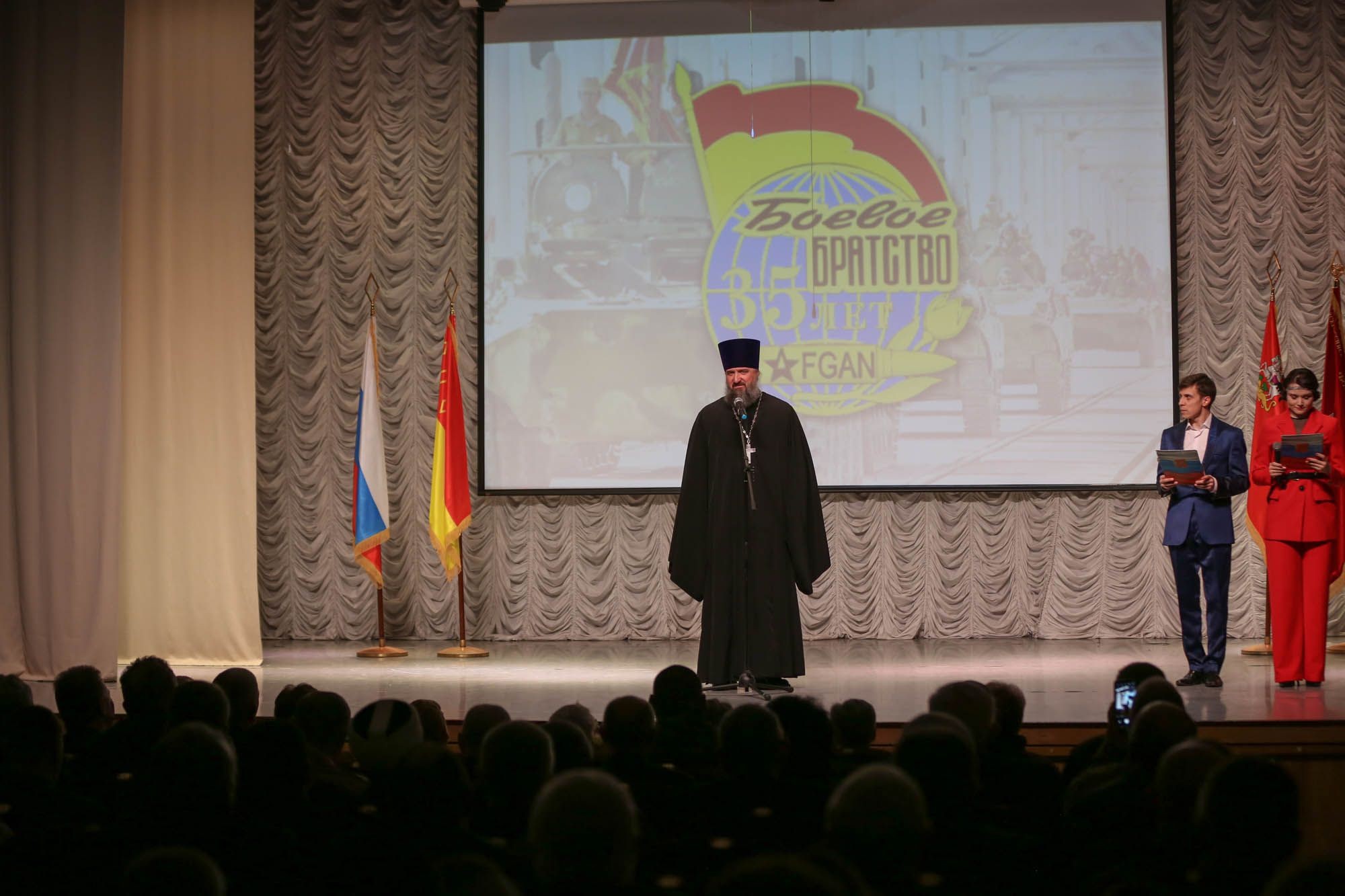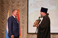 Председатель Межъепархиального отдела по взаимодействию с Вооруженными силами, правоохранительными органами и казачеством Московской митрополии протоиерей Марк Ермолаев обратился к присутствующим с пастырским словом и благословил иконой Спасителя руководителя Богородского окружного отделения «Боевого братства» Александра Хатина.