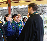 15 курсантов у которых есть действующие отряды, в том числе Ольга Розова и Наталья Купарадзе, получили зелёные галстуки наставников и дали торжественное обещание следопытов служить Богу и России.