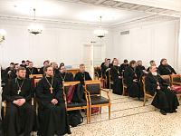 В день ознакомительной встречи с представителями епархий Русской Православной Церкви, к слушателям курсов обратились руководитель Аппарата Синодального отдела религиозного образования и катехизации инок Вячеслав (Серегин), начальник отдела дополнительного образования ОЦАД иерей Георгий Балановский, а также советник главы Рособрнадзора, директор по развитию группы компаний «Просвещение» Наталья Алтынникова.