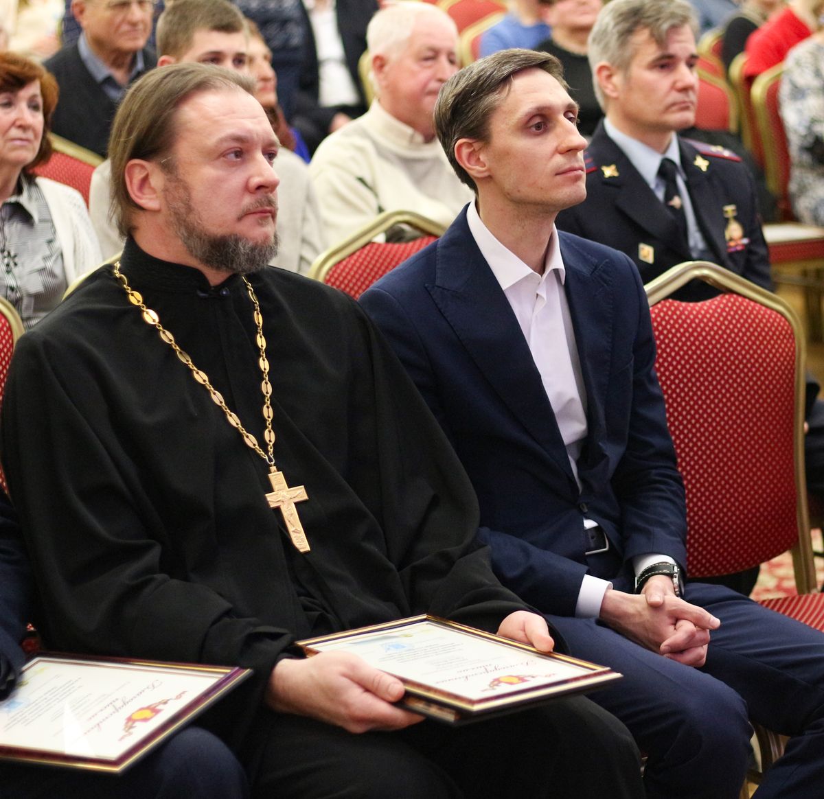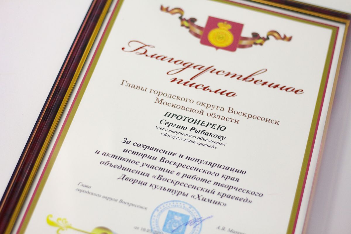 Почётный гость - заместитель главы Администрации городского округа Воскресенск Бахтов Михаил Сергеевич поздравил всех собравшихся и вручил благодарственные письма от главы Администрации городского округа Воскресенск, среди награждённых были благочинные 1-го и 2-го Воскресенского благочиннических округов и пресс-секретарь благочиннического округа, краевед Мамаева Марина Сергеевна.