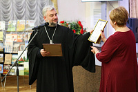 Благочинный 2-го Воскресенского благочиннического округа протоиерей Сергий Рыбаков вручил грамоты от благочиннического округа коллективу творческого объединения, а также поисковику-краеведу Евгению Николаевичу Соловьёву, выразив благодарность за многолетнее сотрудничество и большой вклад в дело сохранение исторического наследия родного края.
